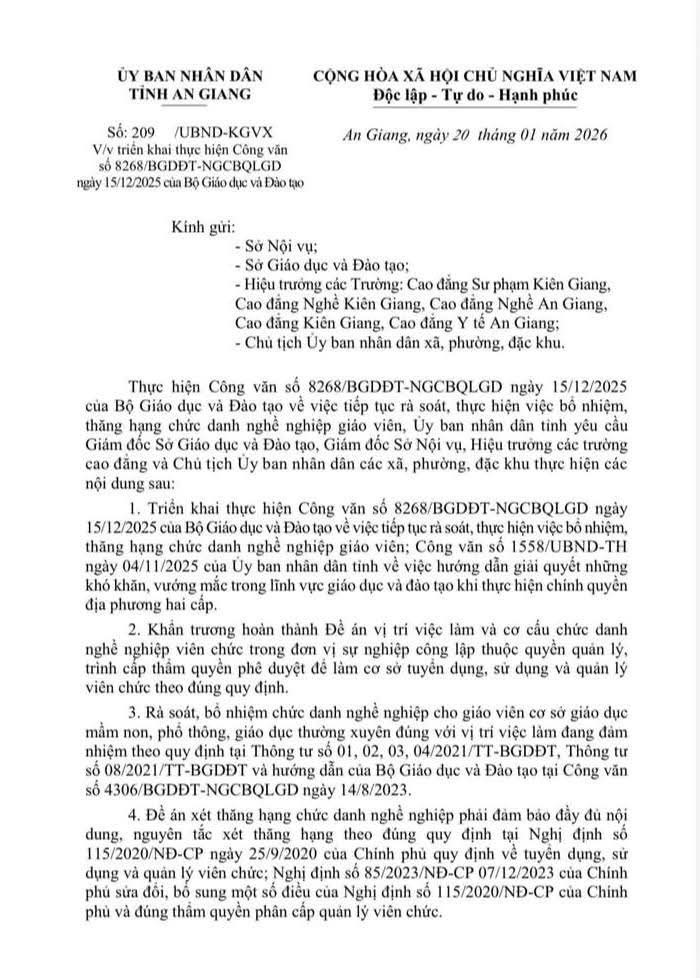 UBND tỉnh An Giang vừa ban hành Công văn số 209/UBND-KGVX ngày 20/1/2026 yêu cầu Giám đốc Sở GD&ĐT, Giám đốc Sở Nội vụ, Hiệu trưởng các Trường Cao đẳng và Chủ tịch Ủy ban nhân dân các xã, phường, đặc khu tiếp tục rà soát, thực hiện việc bổ nhiệm, thăng hạng chức danh nghề nghiệp giáo viên theo Công văn số 8268/BGDĐT-NGCBQLGD ngày 15/12/2025 của Bộ Giáo dục và Đào tạo và Công văn số 1558/UBND-TH ngày 4/11/2025 của UBND tỉnh về việc hướng dẫn giải quyết những khó khăn, vướng mắc trong lĩnh vực Giáo dục và Đào tạo khi thực hiện chính quyền địa phương hai cấp.