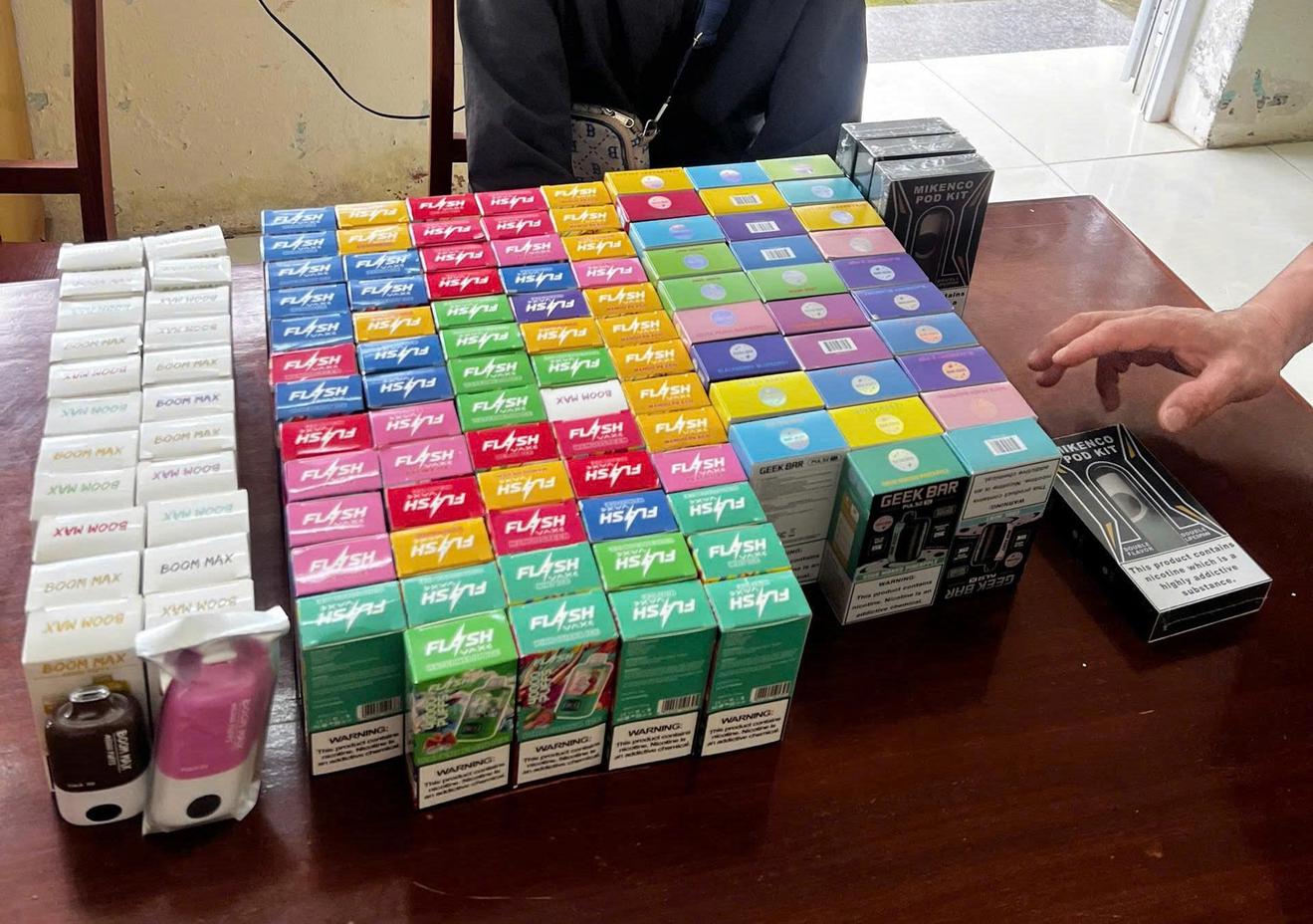 Qua kiểm tra, lực lượng kiểm soát phát hiện trong thùng giấy carton có 32 máy hút thuốc lá điện tử hiệu GEEK BAR, 24 máy hút thuốc lá điện tử hiệu BOOM MAX, 64 máy hút thuốc lá điện tử hiệu FLASH, 4 máy hút thuốc lá điện tử hiệu POD KIT, tất cả đều in chữ nước ngoài, không có tem nhãn tiếng Việt, không rõ nguồn gốc xuất xứ.