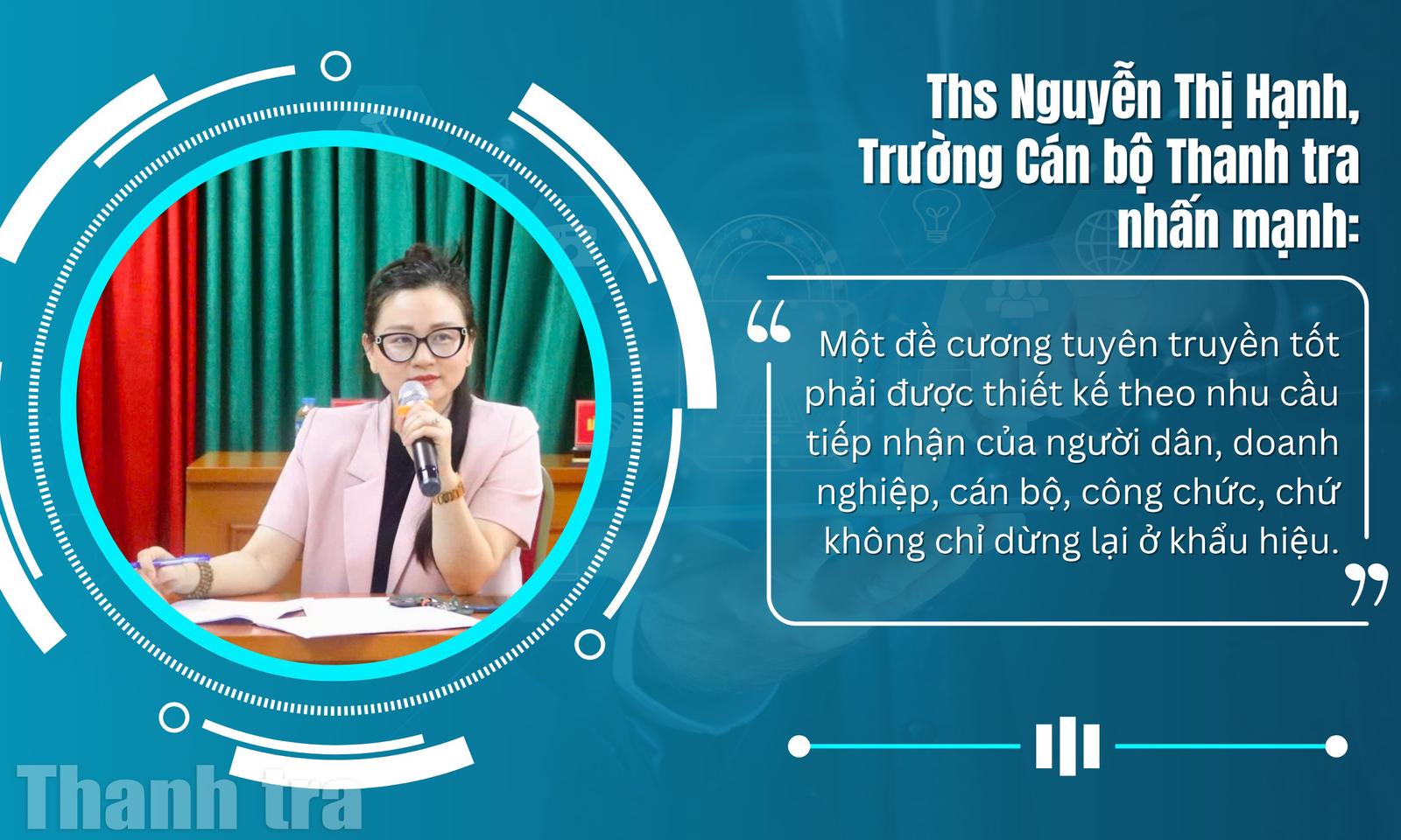 Ths Nguyễn Thị Hạnh (Trường Cán bộ Thanh tra) cho rằng: “Một đề cương tuyên truyền tốt phải được thiết kế theo nhu cầu tiếp nhận của người dân, doanh nghiệp, cán bộ, công chức, chứ không chỉ dừng lại ở khẩu hiệu”. Do đó, cần tiếp tục đa dạng hóa hình thức tuyên truyền, PBGDPL theo hướng linh hoạt, sáng tạo, phù hợp với từng nhóm đối tượng.