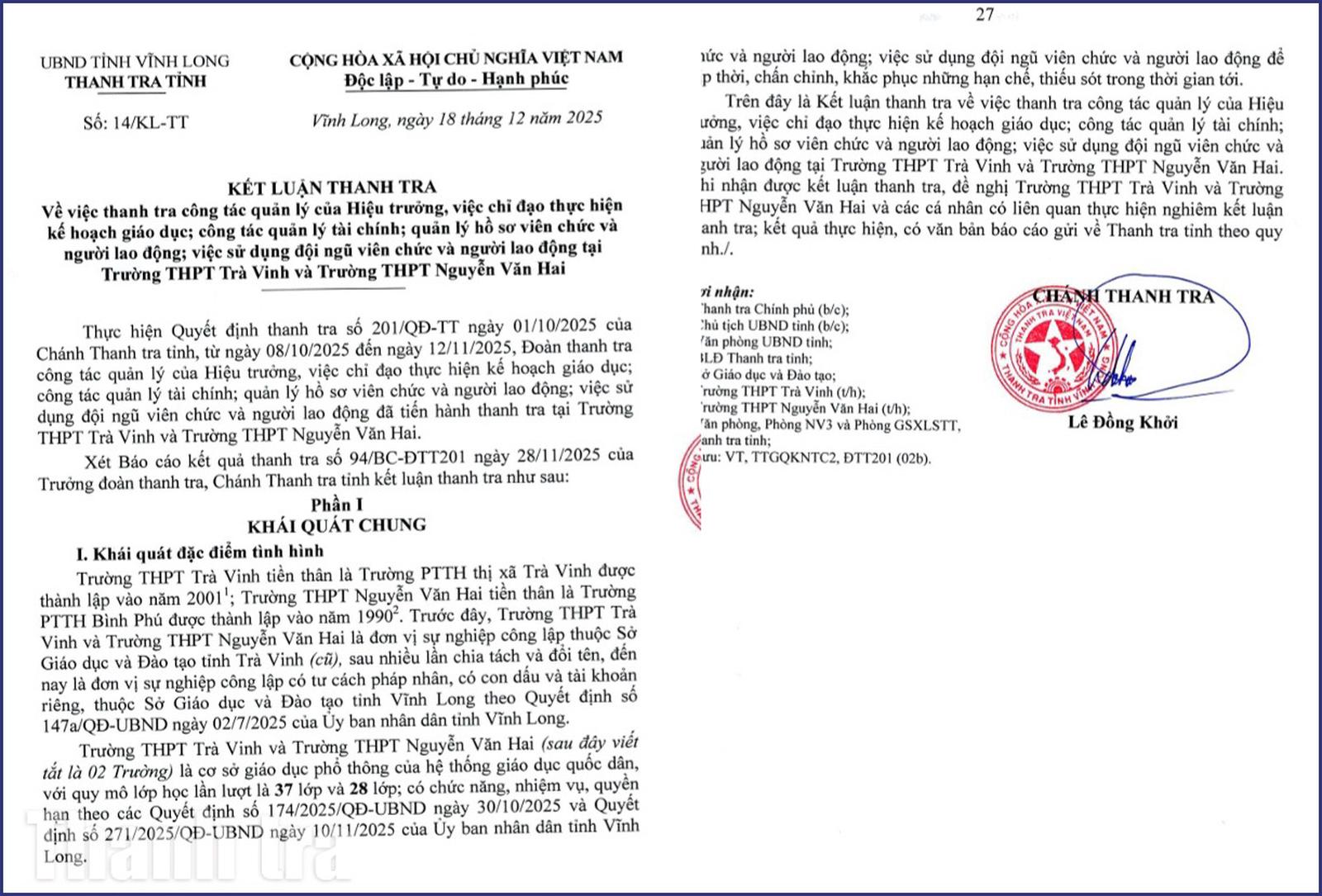 Thanh tra tỉnh Vĩnh Long đã ban hành Kết luận thanh tra số 14/KL-TT ngày 18/12/2025 về việc thanh tra công tác quản lý của hiệu trưởng, việc chỉ đạo thực hiện kế hoạch giáo dục; công tác quản lý tài chính; quản lý hồ sơ viên chức và người lao động; việc sử dụng đội ngũ viên chức và người lao động tại Trường THPT Trà Vinh và Trường THPT Nguyễn Văn Hai.