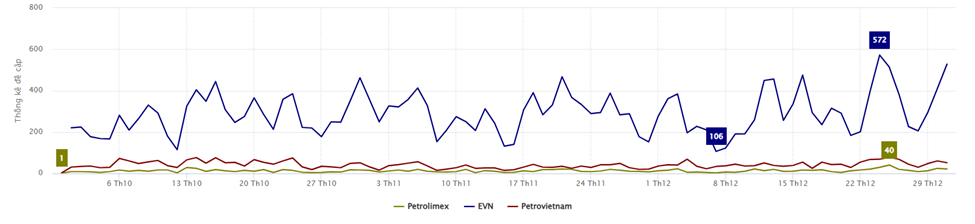 Trong quý IV/2025, EVN tiếp tục chiếm tỷ trọng lớn nhất về tổng lượng đề cập với 79,5%, trong khi Petrovietnam chiếm 11,3% và Petrolimex chiếm 9,3%, cho thấy EVN vẫn là tâm điểm của truyền thông ngành năng lượng trong giai đoạn cuối năm. Các nội dung liên quan đến EVN chủ yếu tập trung vào công tác đảm bảo cung ứng điện, vận hành hệ thống và điều hành sản xuất – kinh doanh phục vụ nhu cầu tiêu thụ điện cao điểm. Trong khi đó, truyền thông về Petrovietnam duy trì các thông tin về hoạt động sản xuất – kinh doanh, vai trò trong chuỗi năng lượng quốc gia và định hướng chuyển dịch năng lượng. Đối với Petrolimex, các đề cập tiếp tục xoay quanh công tác điều hành giá, đảm bảo nguồn cung xăng dầu và hoạt động kinh doanh trong bối cảnh thị trường cuối năm.