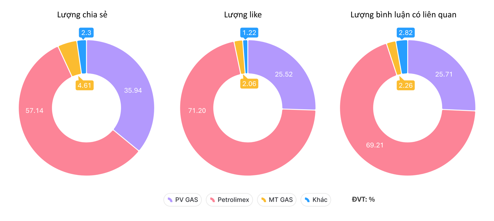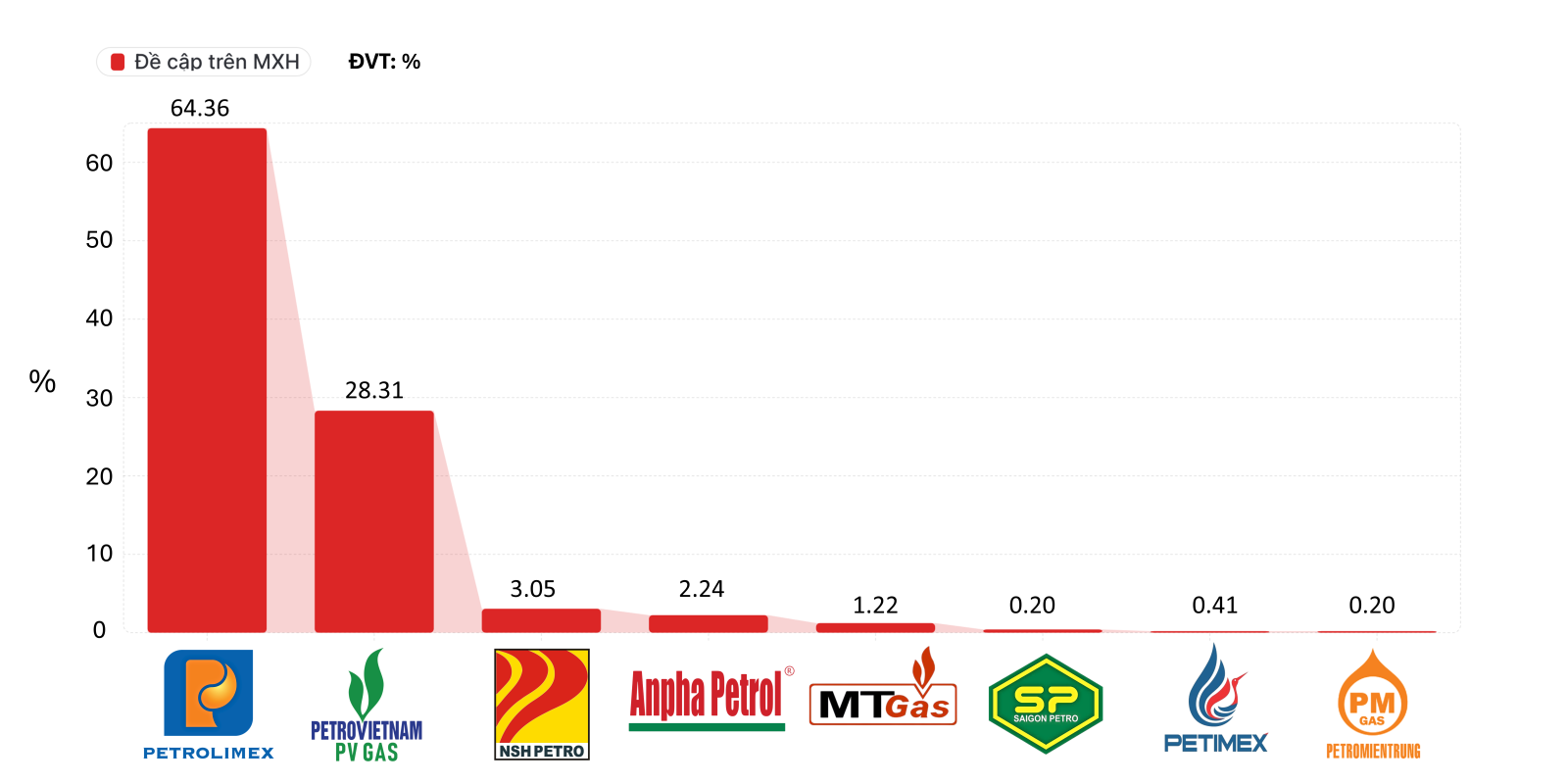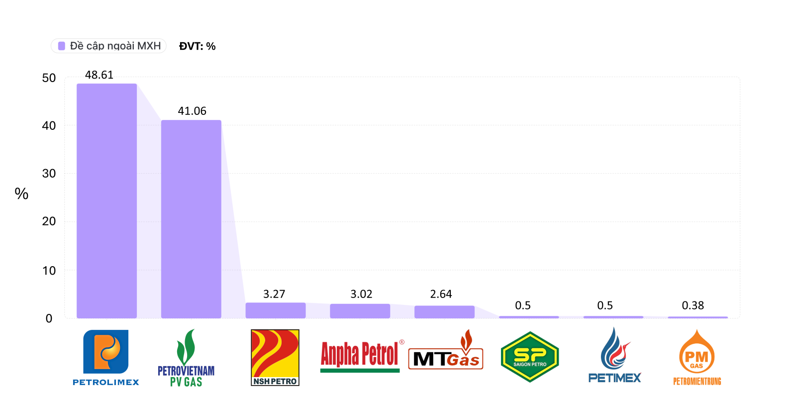 Các thương hiệu còn lại Petimex, Saigon Petro và Petro Miền Trung tiếp tục có tỷ lệ đề cập rất thấp (trên mạng xã hội lần lượt đạt 0,2%, 0,41% và 0,2%; ngoài mạng xã hội lần lượt đạt 0,5%, 0,5% và 0,38%), cho thấy thách thức lớn trong việc mở rộng độ phủ và gia tăng tương tác truyền thông.