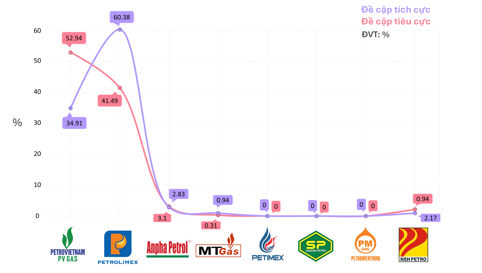 Về đề cập tích cực, Petrolimex tiếp tục dẫn đầu với tỷ lệ 60,38%, cho thấy thương hiệu này vẫn duy trì được mức độ phủ sóng và hình ảnh uy tín cao trên các nền tảng truyền thông. PV GAS xếp thứ hai với 34,91%, khẳng định vị thế ổn định và niềm tin từ công chúng trong ngành LPG. Trong khi đó, Anpha Petrol, MT GAS và NSH PETRO ghi nhận tỷ lệ đề cập tích cực khá thấp, lần lượt đạt 2,83%, 0,94% và 0,94%, chủ yếu đến từ các hoạt động truyền thông mang tính nhận diện thương hiệu. Các thương hiệu như Petimex, Saigon Petro và Petro Miền Trung không có đề cập tích cực trong kỳ, phản ánh mức độ hiện diện truyền thông vẫn còn nhiều hạn chế và có nhiều không gian để cải thiện.