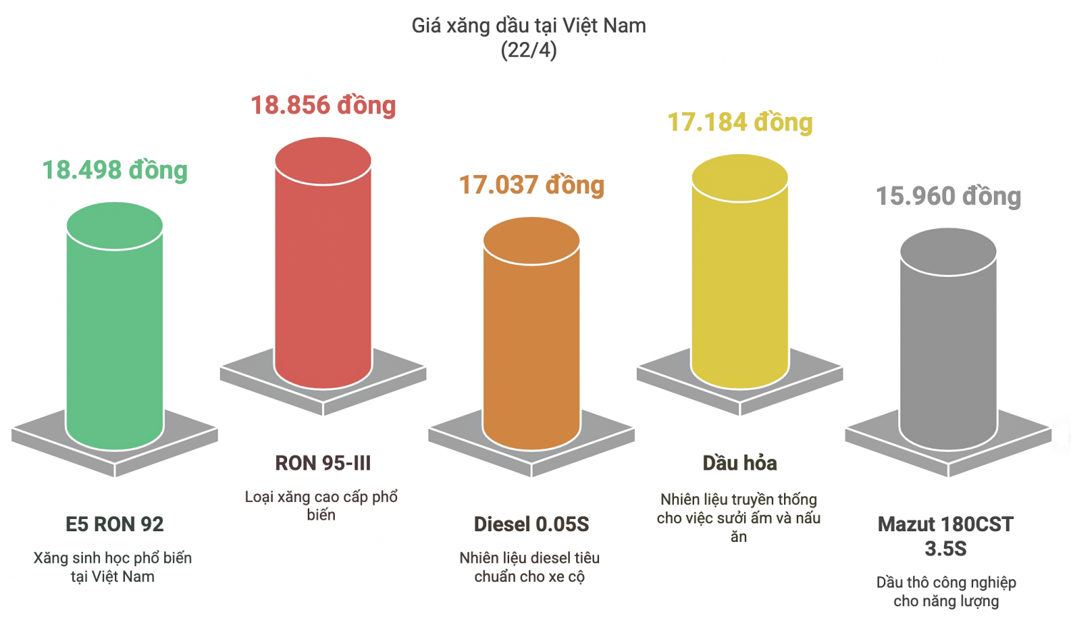 Tại thị trường trong nước, giá xăng dầu hôm nay được niêm yết phổ biến như sau: Giá xăng E5 RON 92 không cao hơn 18.498 đồng/lít; giá xăng RON 95-III không cao hơn 18.856 đồng/lít; giá dầu diesel 0.05S không cao hơn 17.037 đồng/lít; giá dầu hỏa không cao hơn 17.184 đồng/lít; giá dầu mazut 180CST 3.5S không cao hơn 15.960 đồng/kg.