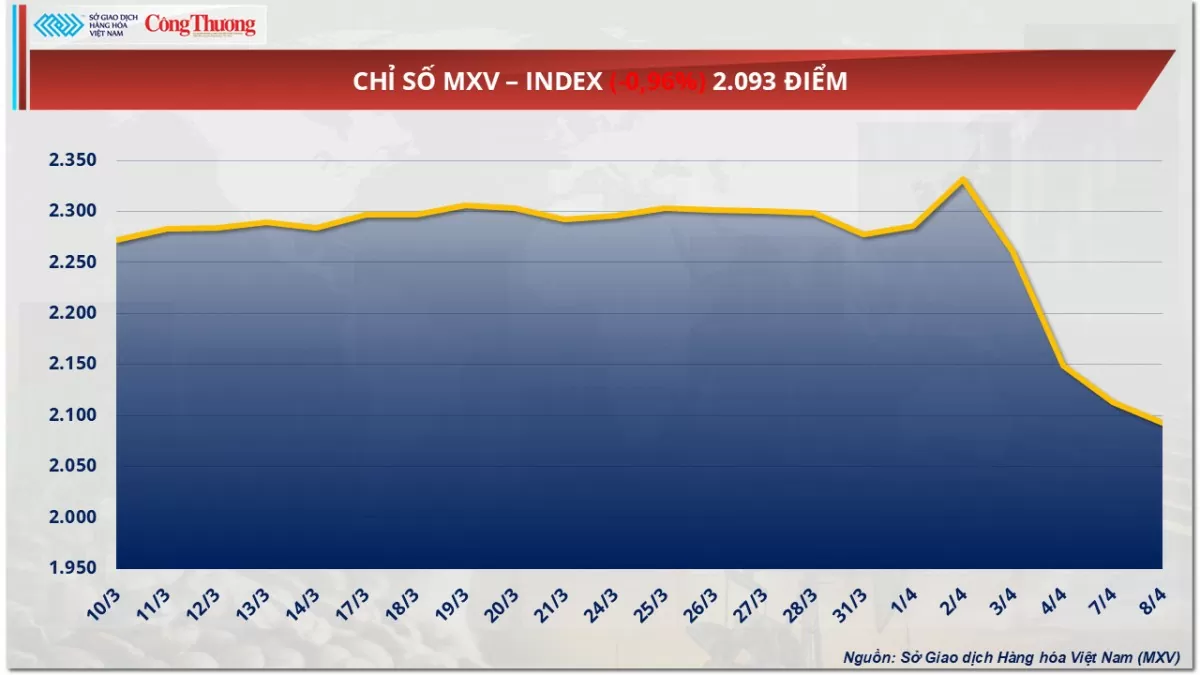 Sở Giao dịch Hàng hóa Việt Nam (MXV) cho biết sắc đỏ tiếp tục áp đảo trên bảng giá hàng hóa nguyên liệu thế giới trong ngày giao dịch hôm qua (8/4). Đóng cửa, chỉ số MXV-Index rơi tiếp gần 1% xuống mốc 2.093 điểm. Nhóm năng lượng dẫn dắt đà giảm của toàn thị trường, giá hai mặt hàng dầu thô lao xuống mức thấp nhất trong vòng 4 năm; trong khi đó thị trường nông sản đã có phiên giao dịch đặc biệt khi 6 trên 7 mặt hàng đồng loạt tăng giá.