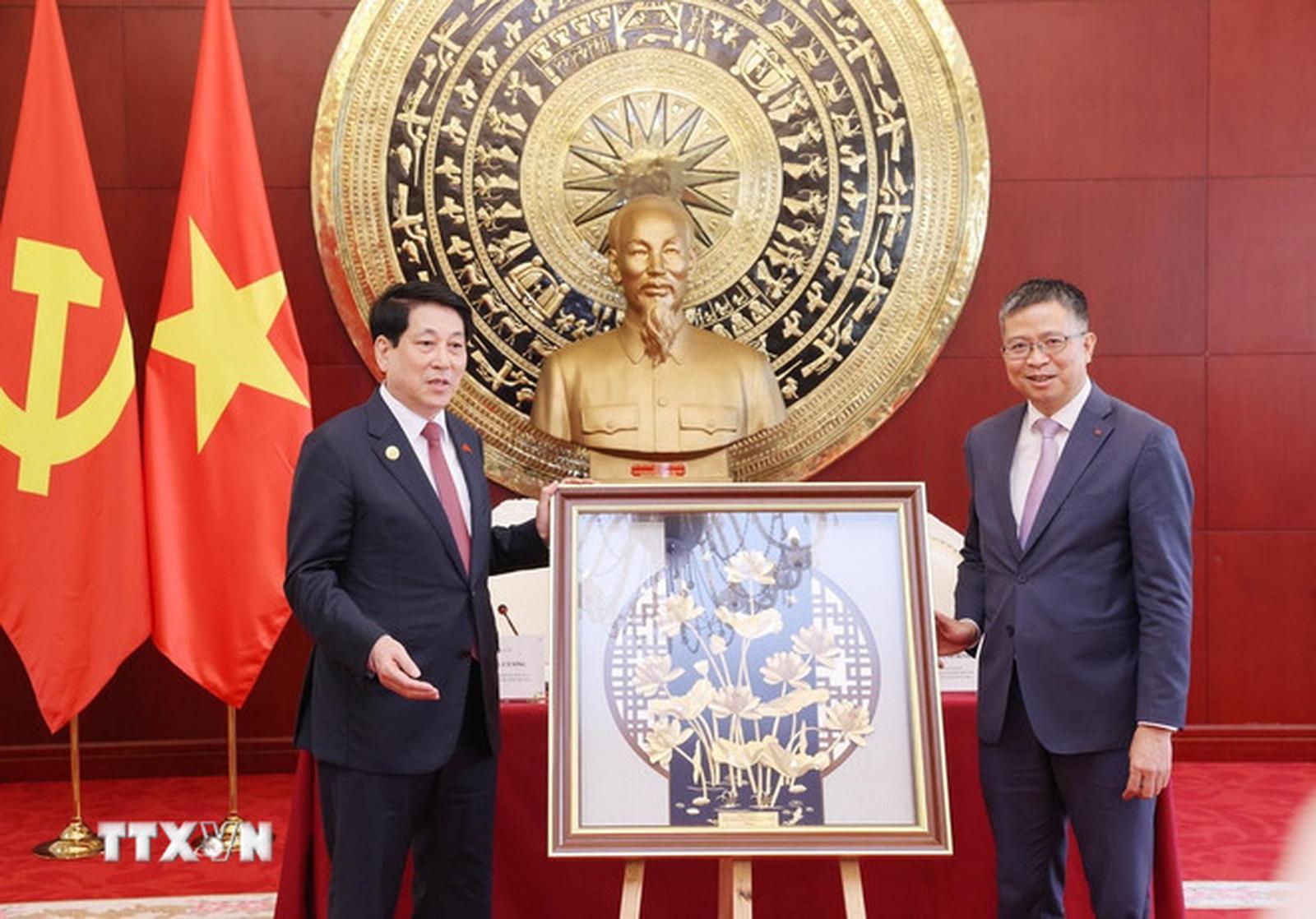 Chủ tịch nước Lương Cường trao quà lưu niệm tặng Đại sứ quán Việt Nam tại Trung Quốc. Ảnh: Lâm Khánh/TTXVN