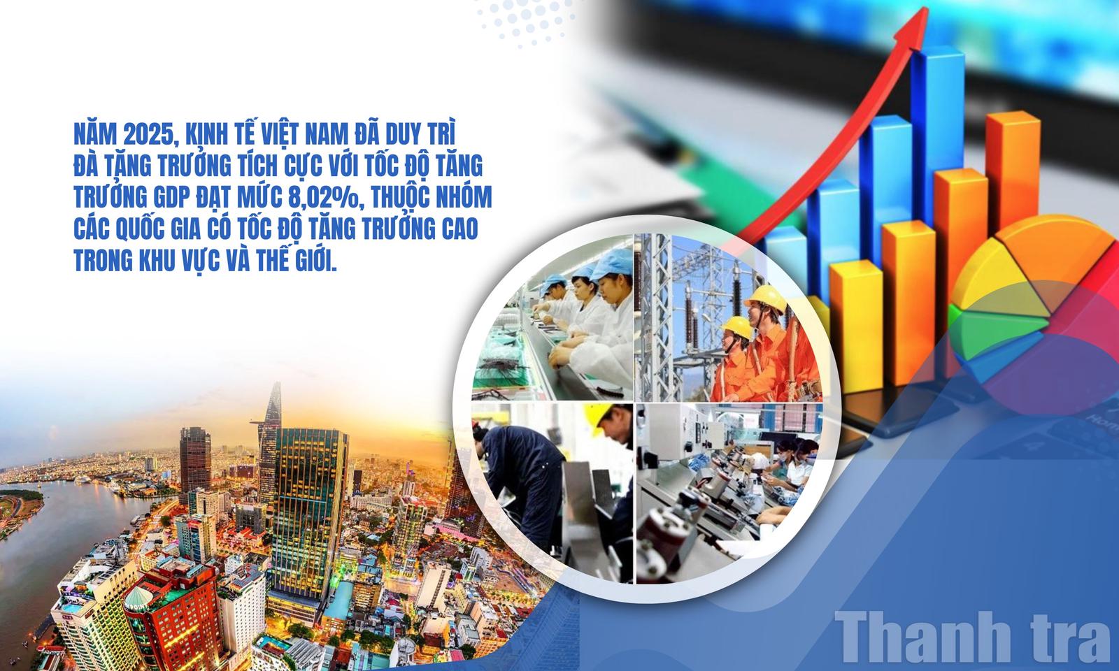 Kinh tế duy trì đà phục hồi và tăng trưởng tích cực, tăng trưởng GDP năm 2025 đạt 8,02%, thuộc nhóm các quốc gia có tốc độ tăng trưởng cao trong khu vực và thế giới. Quy mô nền kinh tế đạt khoảng 514 tỷ USD, GDP bình quân đầu người đạt 5.026 USD, đưa Việt Nam vào nhóm nước có thu nhập trung bình cao.