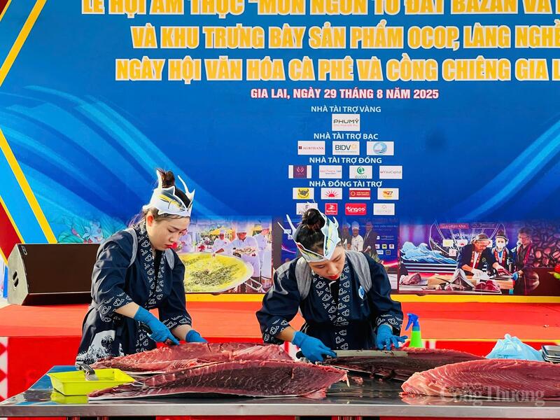 Hoạt động mổ cá ngừ đại dương tại Lễ hội tinh hoa Đại ngàn - Biển xanh hội tụ Gia Lai năm 2025 thu hút nhiều du khách.