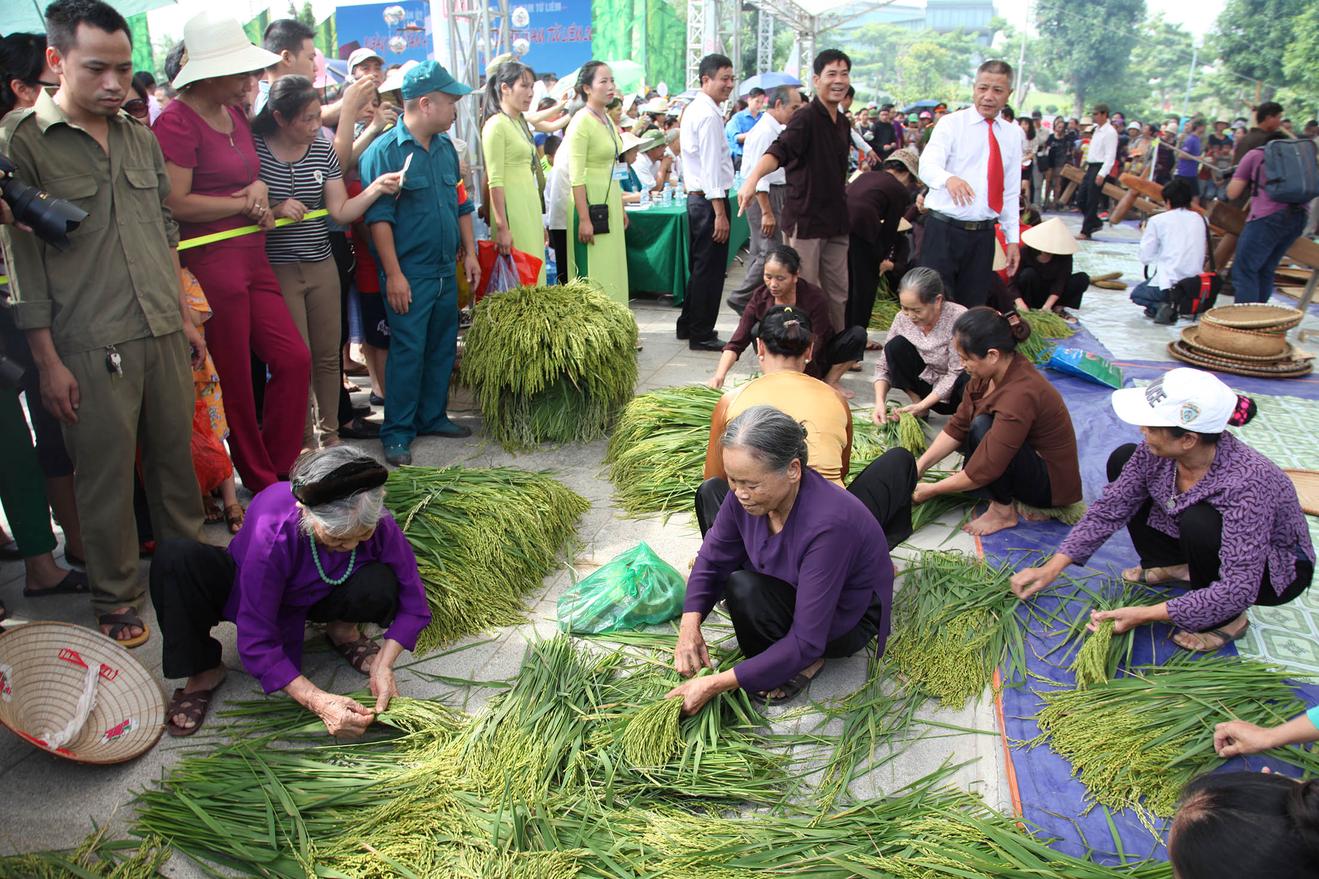 Du khách trải nghiệm tại hội thi làm cốm Mễ Trì- quận Nam Từ Liêm Hà Nội.