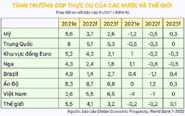 Theo dự báo đã được công bố vào tháng 6-2021, GDP thế giới ước tính tăng trưởng 5,5% trong năm 2021, rồi giảm dần xuống 4,1% trong năm 2022 và 3,2% trong năm 2023. Tuy nhiên, với tình hình lây lan của biến thể Omicron và lạm phát ở nhiều nền kinh tế, tăng trưởng GDP năm 2021 và 2022 bị điều chỉnh giảm 0,2%, tức chỉ còn 5,3% trong năm 2021 và 3,9% trong năm 2022.