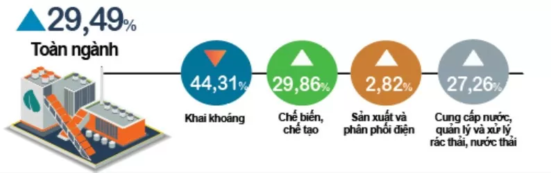 Trong đó, ngành chế biến, chế tạo tăng 29,86%, đóng góp 29,18 điểm phần trăm vào mức tăng chung; ngành sản xuất và phân phối điện, khí đốt, nước nóng, hơi nước và điều hòa không khí tăng 2,82%, đóng góp 0,07 điểm phần trăm; ngành cung cấp nước, hoạt động quản lý và xử lý rác thải, nước thải tăng 27,26%, đóng góp 0,41 điểm phần trăm; riêng ngành khai khoáng giảm 44,31%, làm giảm 0,17 điểm phần trăm.