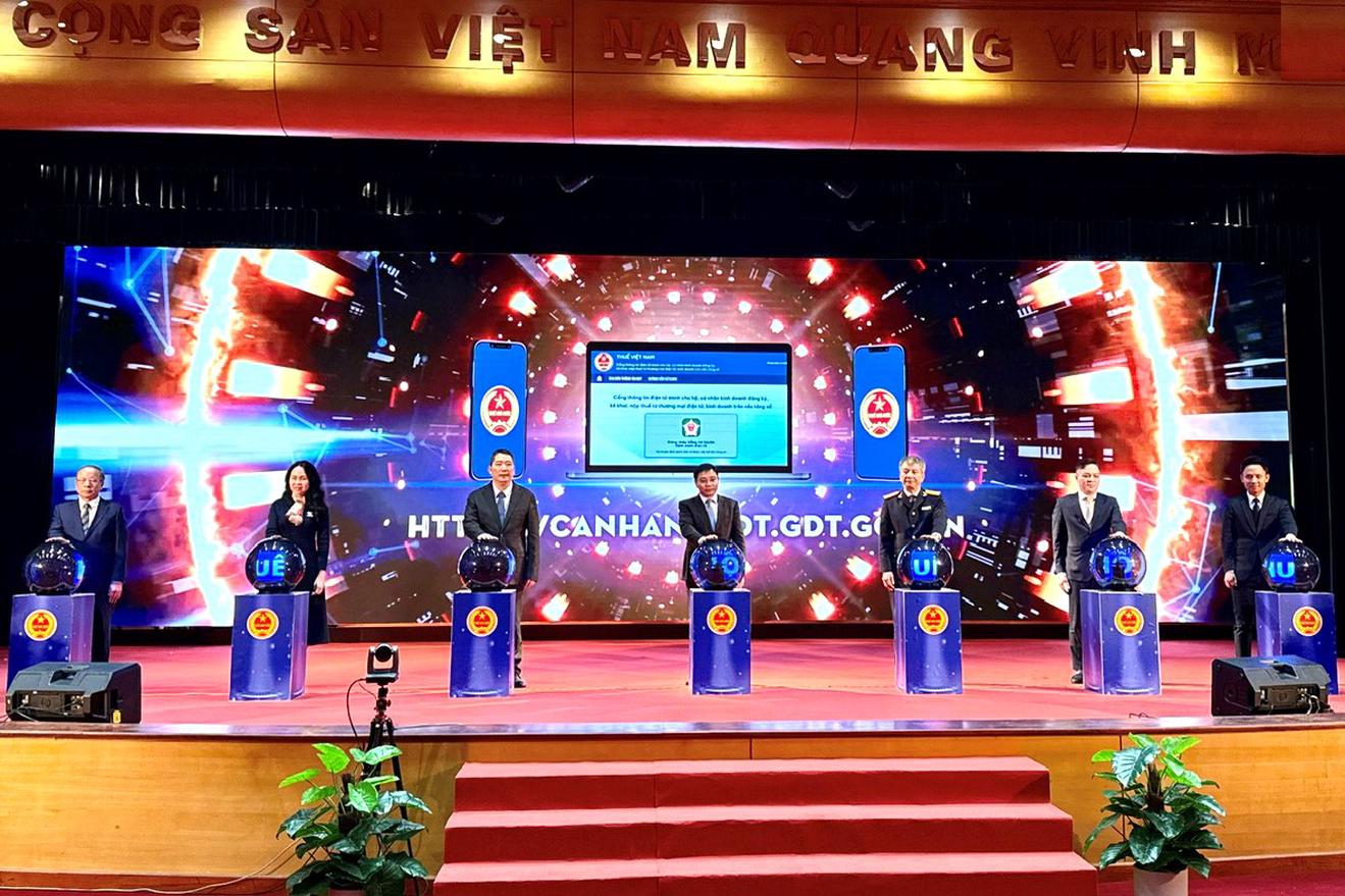 Bộ trưởng Nguyễn Văn Thắng; Thứ trưởng Cao Anh Tuấn và Tổng cục trưởng Mai Xuân Thành cùng đại diện lãnh đạo các đơn vị thực hiện nghi lễ kích hoạt chính thức vận hành Cổng TTĐT dành cho hộ, cá nhân kinh doanh đăng ký, kê khai, nộp thuế từ thương mại điện tử, kinh doanh trên nền tảng số, ngày 19/12/2024. Ảnh: TCT