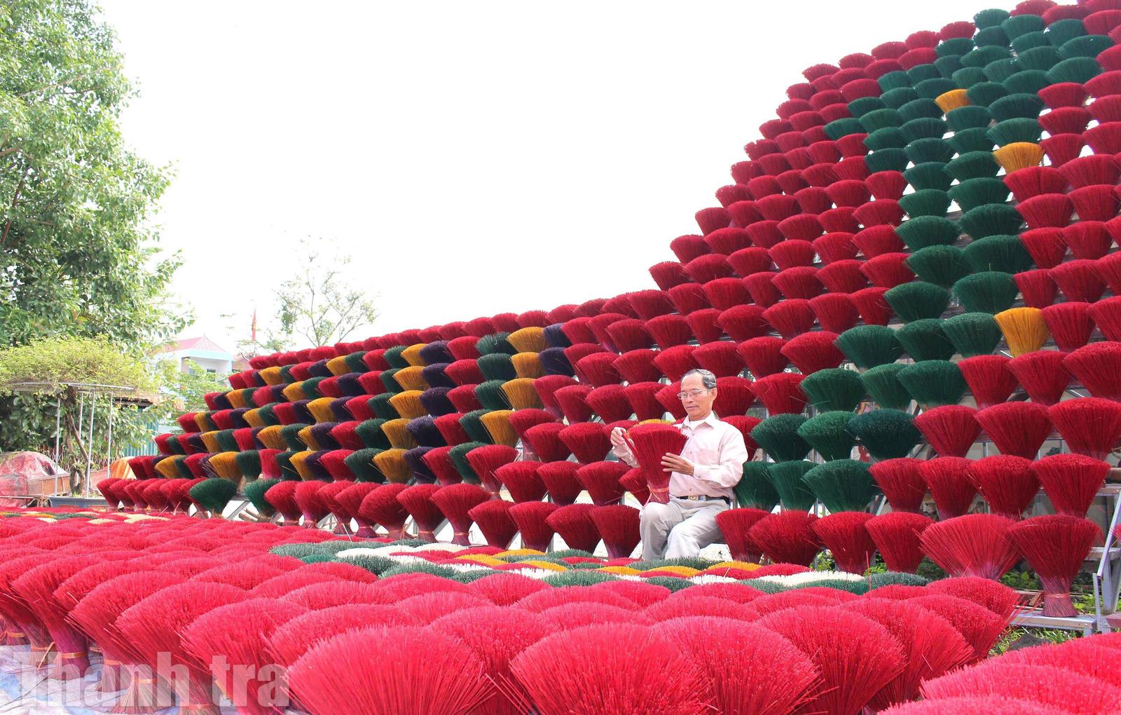 Hơn nửa thế kỷ gắn bó với nghiệp làm hương, đôi bàn tay cụ đã chai sần, in hằn dấu vết thời gian và những năm tháng “nhuộm đỏ” vì nghề.