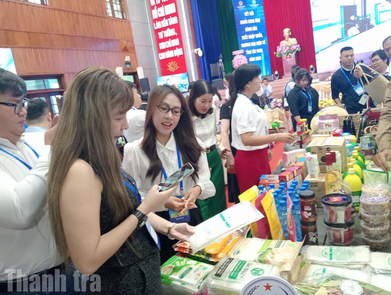 Sản phẩm của tỉnh Tây Ninh được trưng bày tại hội nghị kết nối chuỗi cung ứng hàng hóa xuất nhập khẩu và thương mại điện tử. Ảnh: Thu Huyền