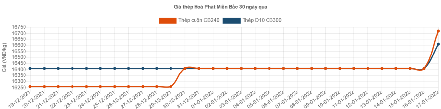 Sau thời gian giữ ổn định, ngày 17/01/2022 các thương hiệu thép lớn trong nước đồng loạt điều chỉnh giá thép xây dựng từ mức 16.540 đồng/kg – 17.050 đồng/kg đối với thép cuộn CB240 và từ 16.410 đồng/kg – 17.000 đồng/kg với thép thanh D10 CB300…