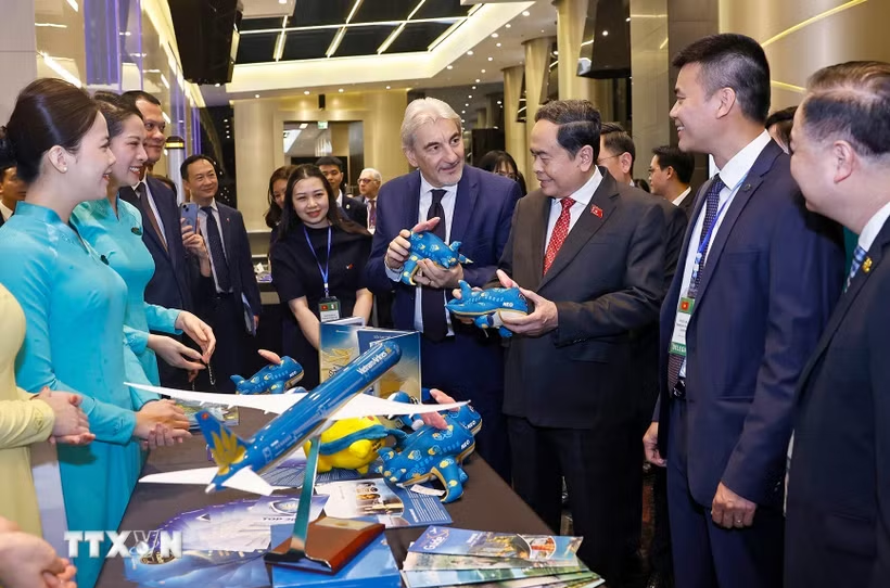 Chủ tịch Quốc hội Trần Thanh Mẫn và đại biểu tham quan gian hàng của Vietnam Airlines