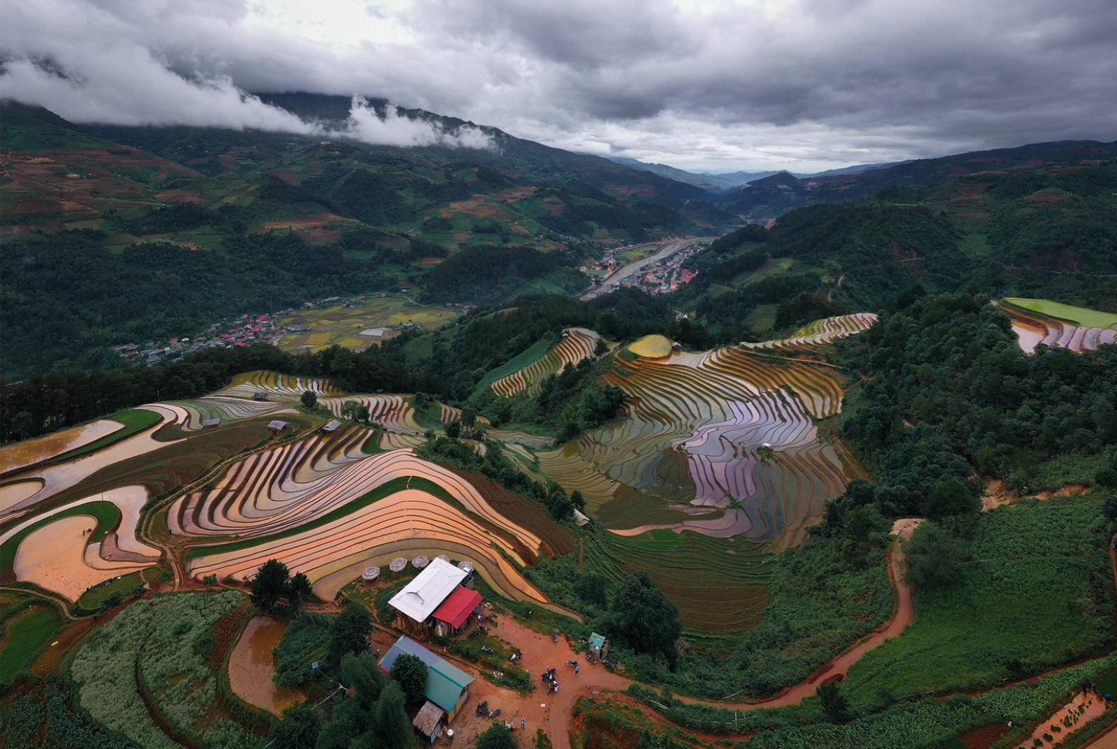 Ruộng bậc thang Mù Cang Chải mùa đổ nước – Những đường cày uốn lượn phản chiếu ánh trời, tạo nên bức tranh thiên nhiên kỳ vĩ của vùng cao Tây Bắc. Ảnh: Tuấn Vũ
