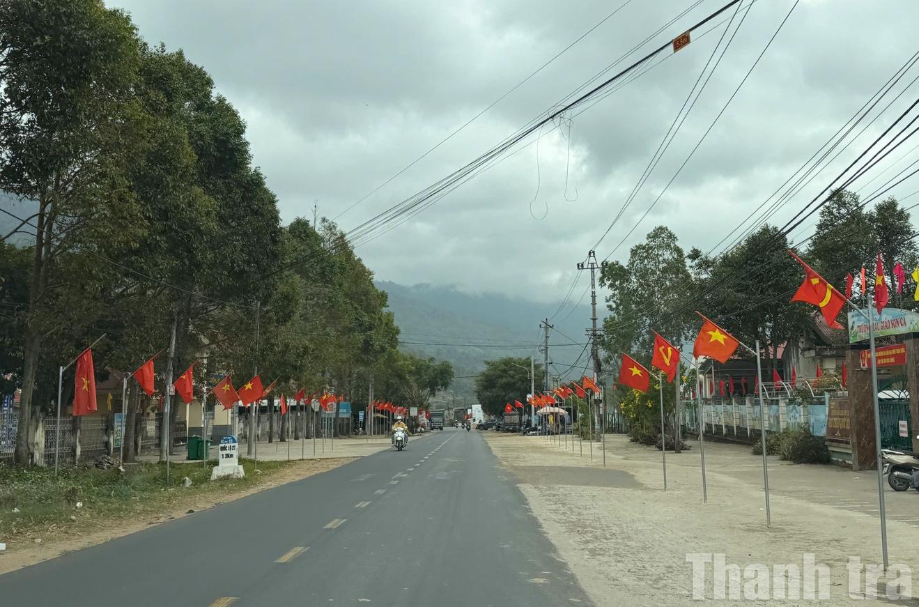 Cờ Tổ quốc rợp đỏ các tuyến đường ở các buôn làng, thể hiện niềm tin và sự đồng thuận của đồng bào các dân tộc tỉnh Đắk Lắk đối với thành công của Đại hội XIV. Ảnh: NG