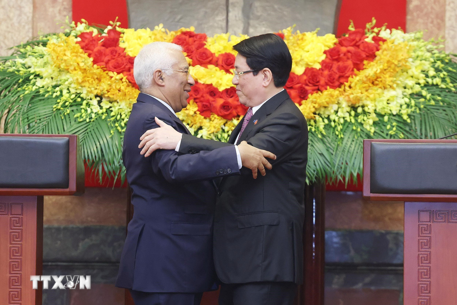 Chủ tịch nước Lương Cường và Chủ tịch Hội đồng châu Âu Antonio Costa sau gặp gỡ báo chí