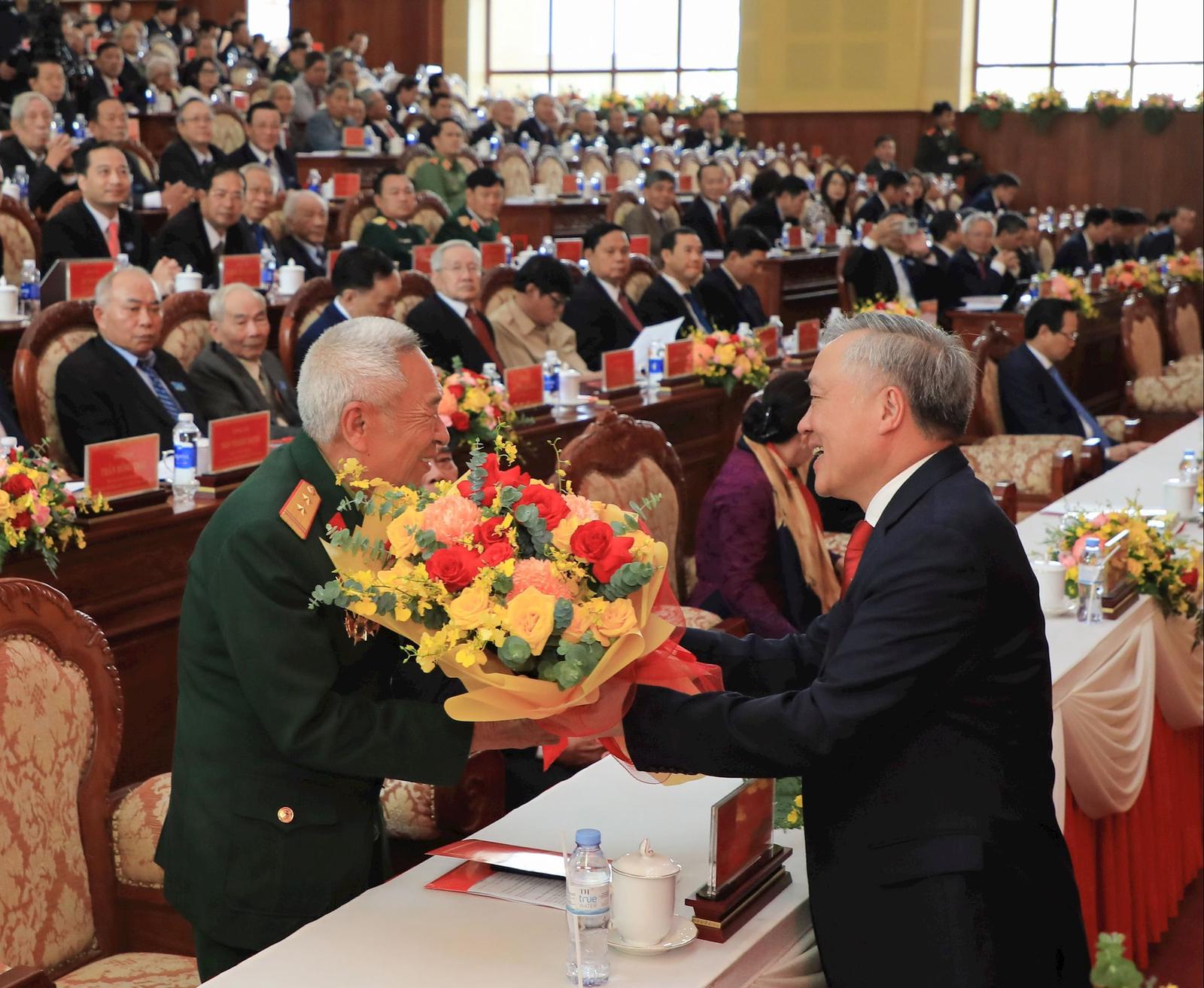 Ủy viên Bộ Chính trị, Phó Thủ tướng Thường trực Chính phủ Nguyễn Hòa Bình tặng hoa Anh hùng Lực lượng vũ trang Nhân dân Hoàng Đình Kiền. Ảnh: Vũ Linh