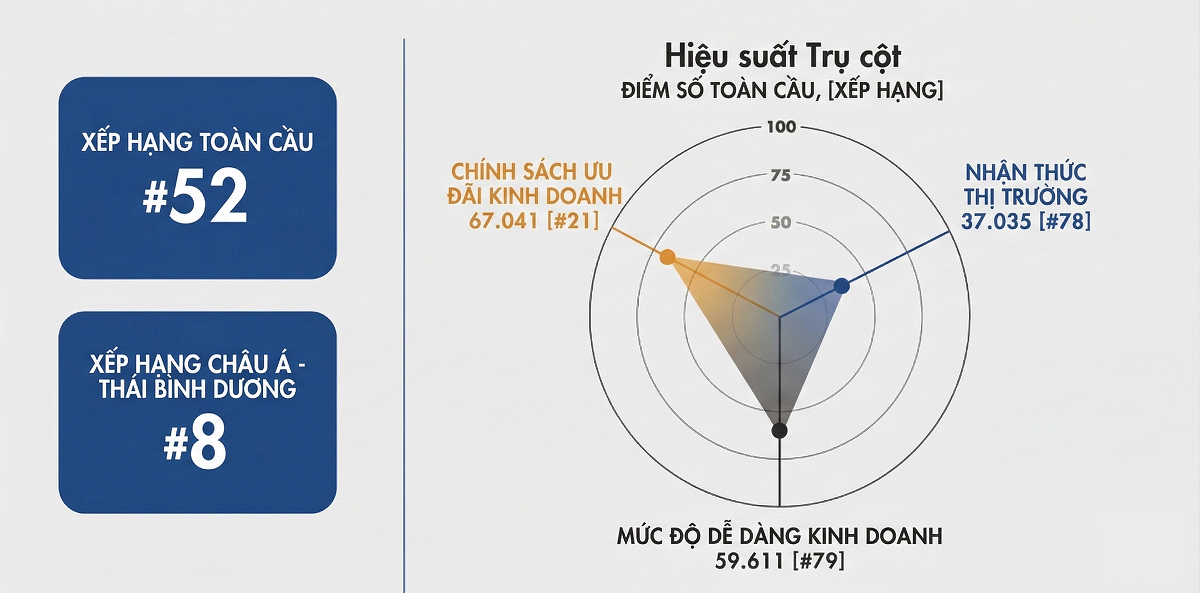 Ba trụ cột tạo nên chỉ số này gồm mức độ thuận lợi khi vận hành doanh nghiệp, các ưu đãi dành cho doanh nghiệp và nhận thức của thị trường. Trong đó, riêng trụ cột về ưu đãi, Việt Nam đạt 67 điểm, đứng thứ 21 toàn cầu. Hai trụ cột còn lại đứng trong khoảng 70 - 80 toàn cầu.