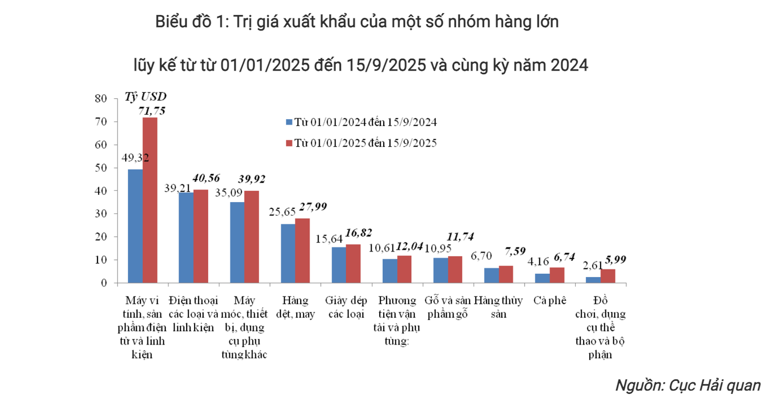 Trị giá xuất khẩu kỳ 1 tháng 9 /2025 giảm so với kỳ 2 tháng 8/2025 ở các nhóm hàng sau: Điện thoại các loại và linh kiện giảm 886 triệu USD, tương ứng giảm 27,2%; máy vi tính, sản phẩm điện tử và linh kiện giảm 691 triệu USD, tương ứng giảm 12,5%; hàng dệt may giảm 510 triệu USD, tương ứng giảm 25,3%; giày dép các loại giảm 272 triệu USD, giảm 27%...