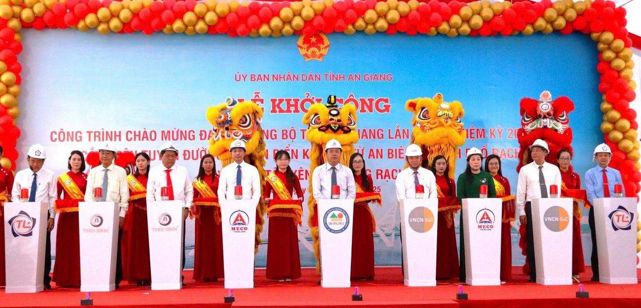 Chào mừng Đại hội đại biểu Đảng bộ tỉnh lần thứ I, nhiệm kỳ 2025 - 2030, tỉnh An Giang khởi công, khánh thành 10 công trình, dự án gồm: Cảng Hàng không Quốc tế Phú Quốc; đường tỉnh 975 tại Phú Quốc; Đại lộ APEC; hồ nước Cửa Cạn; Trung tâm Hội nghị APEC; cầu trên tuyến đường bộ ven biển kết nối An Biên - Rạch Giá; tuyến đường vành đai song song với tuyến đường tỉnh 942 (xã An Hội); tuyến đường vòng Công viên Văn hóa Núi Sam; nâng cấp, mở rộng đường Hương Lộ 11; Trường THCS Phú Thọ.