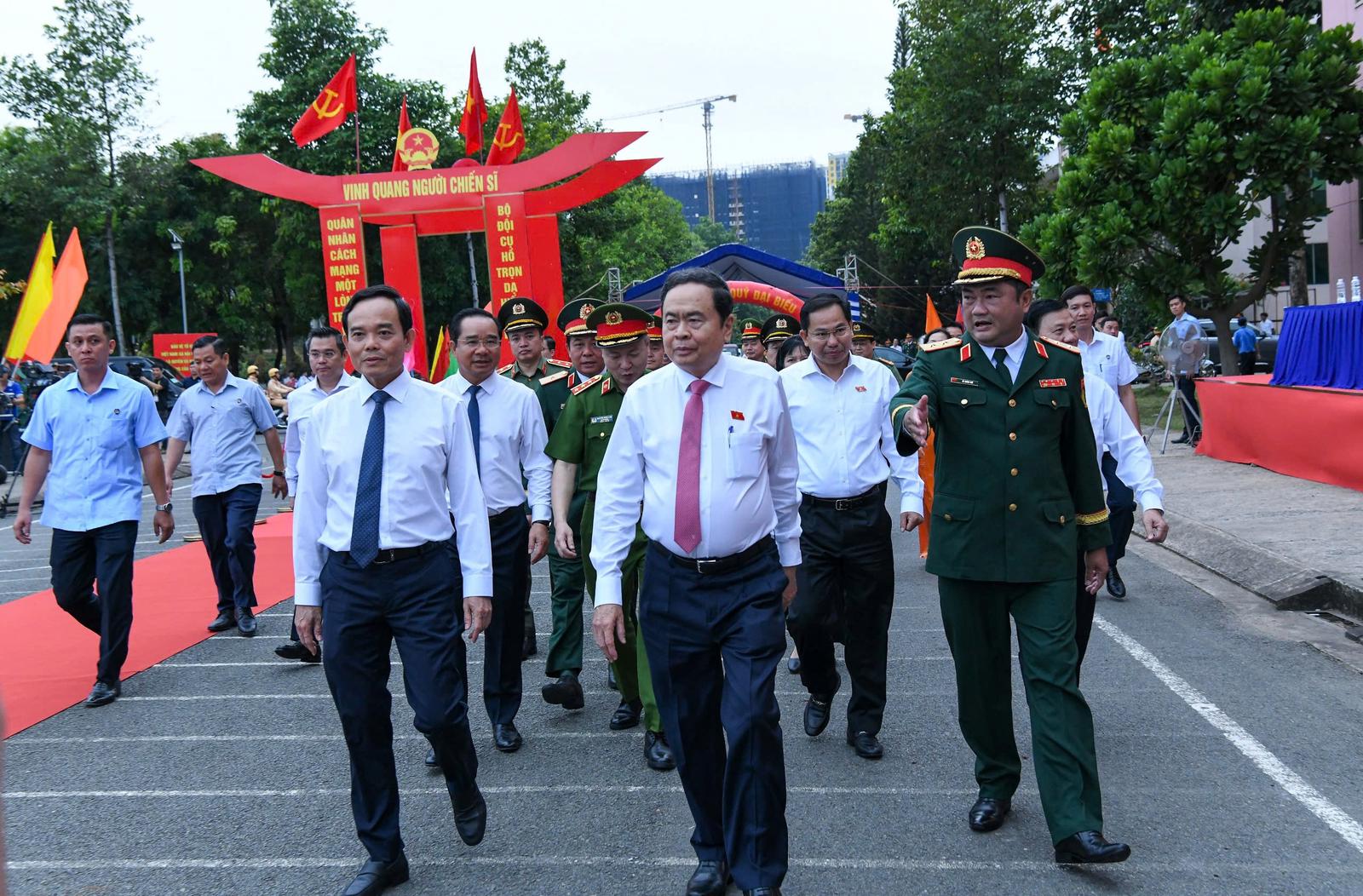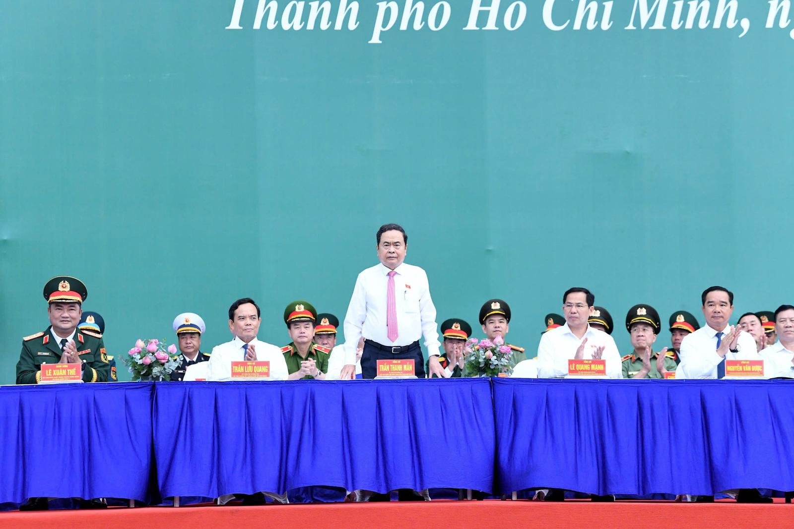 Chủ tịch Quốc hội Trần Thanh Mẫn, Bí thư Thành ủy TPHCM Trần Lưu Quang và các đại biểu đến Lễ giao nhận quân năm 2026 của TPHCM. Ảnh: QH