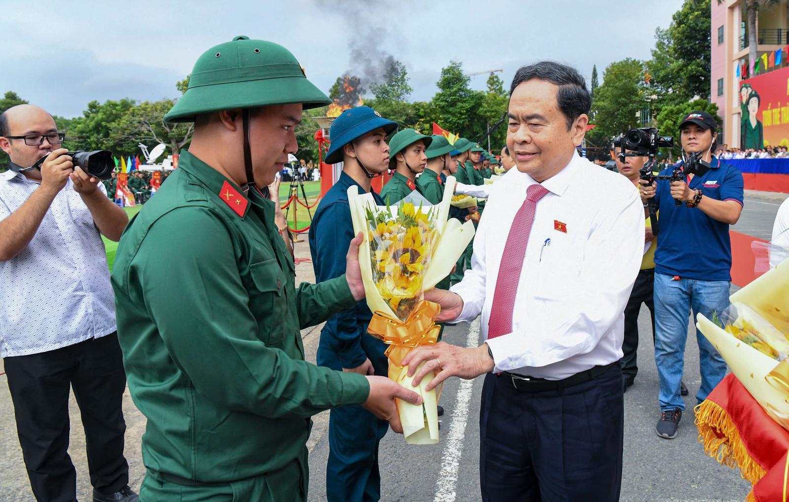 Chủ tịch Quốc hội Trần Thanh Mẫn tặng quà cho các tân binh. Ảnh: QH