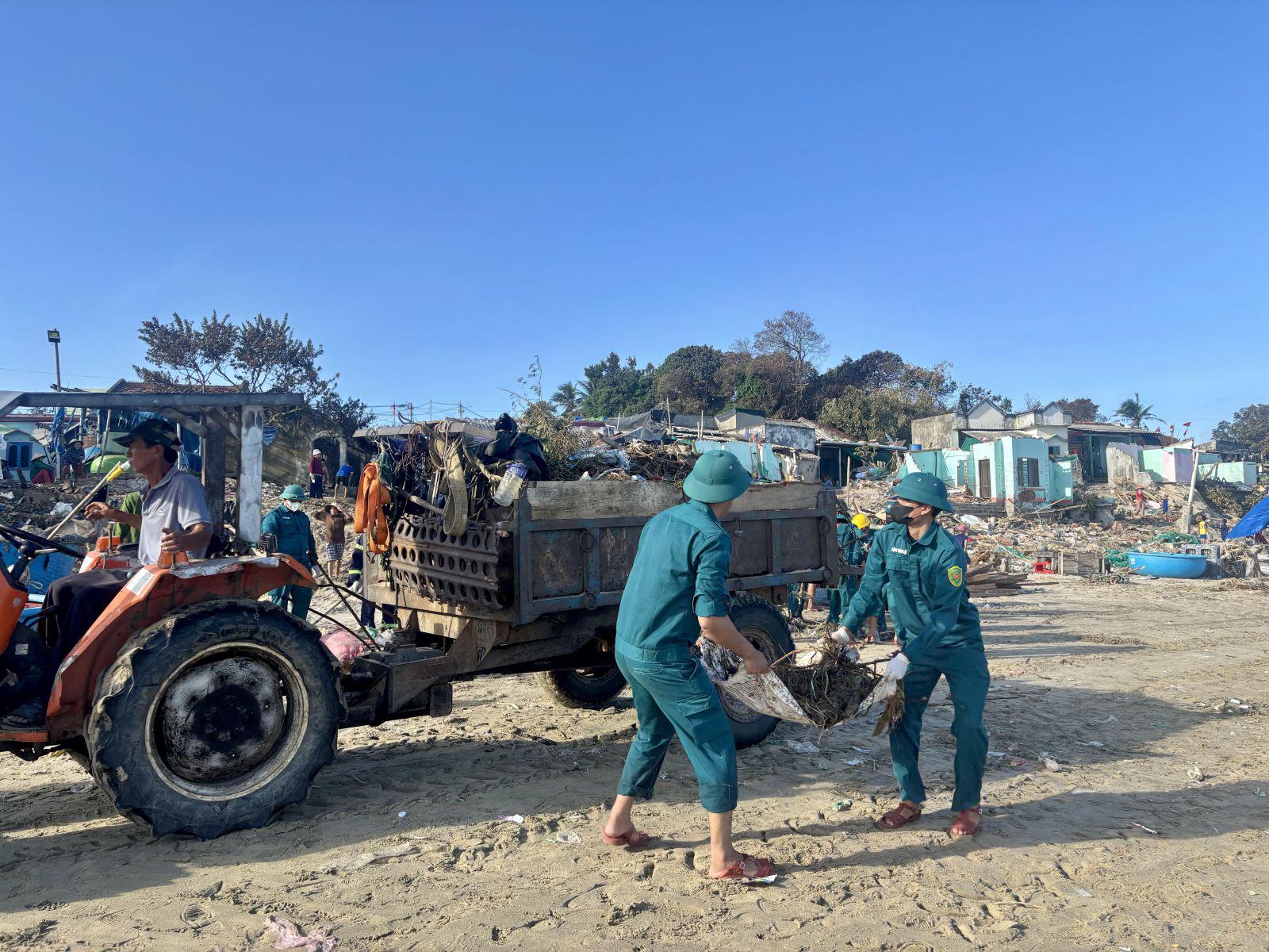 Lực lượng chức năng tích cực hỗ trợ người dân thôn Xuân Thạnh và Xuân Thạnh Nam khắc phục hậu quả sau bão. Ảnh: Gia Lai