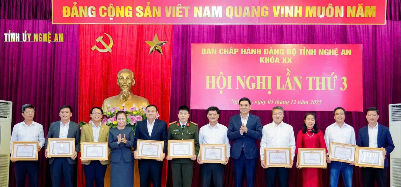 Ban Thường vụ Tỉnh ủy Nghệ An quyết định tặng Bằng khen cho 5 tập thể và 10 cá nhân có thành tích xuất sắc trong chỉ đạo, tham mưu, phục vụ Đại hội Đảng bộ tỉnh lần thứ XX. Ảnh: Phạm Bằng