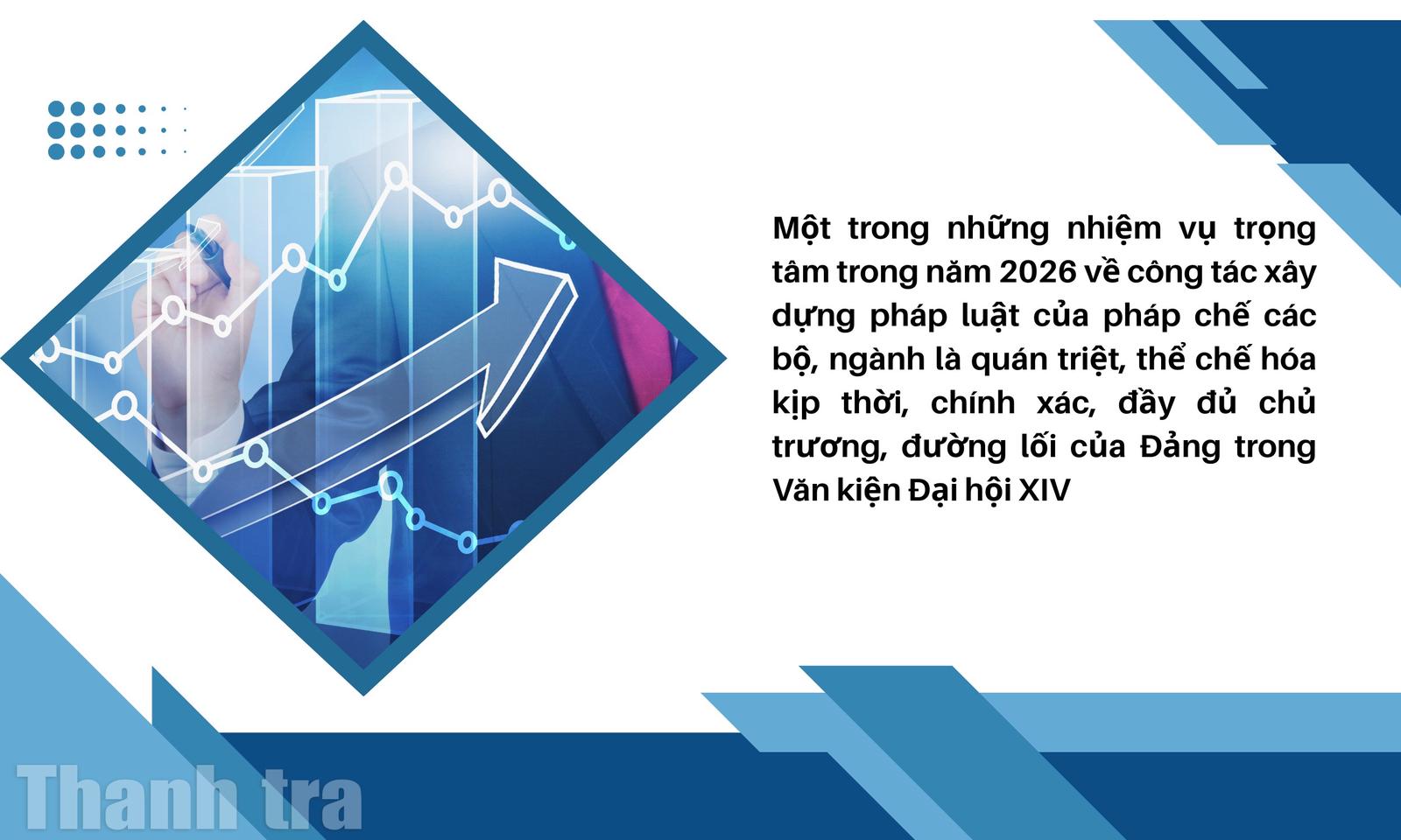 Cụ thể, pháp chế bộ, ngành xác định phải quán triệt, thể chế hóa kịp thời, chính xác, đầy đủ chủ trương, đường lối của Đảng trong Nghị quyết Đại hội XIV, các nghị quyết, kết luận, chỉ thị của Bộ Chính trị, Ban Bí thư, các văn bản chỉ đạo của Quốc hội, Ủy ban Thường vụ Quốc hội, Chính phủ, Thủ tướng về phát triển kinh tế - xã hội nhiệm kỳ 2026-2030 và năm 2026.