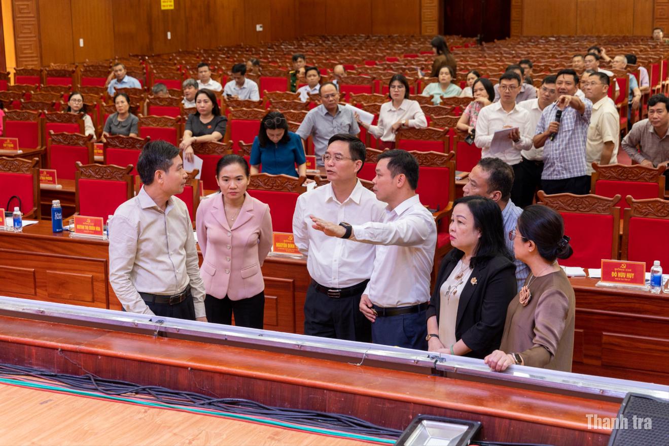 Thường trực Tỉnh ủy Đắk Lắk kiểm tra công tác trang trí, khánh tiết phục vụ Đại hội đại biểu Đảng bộ tỉnh lần thứ I. Ảnh: NG
