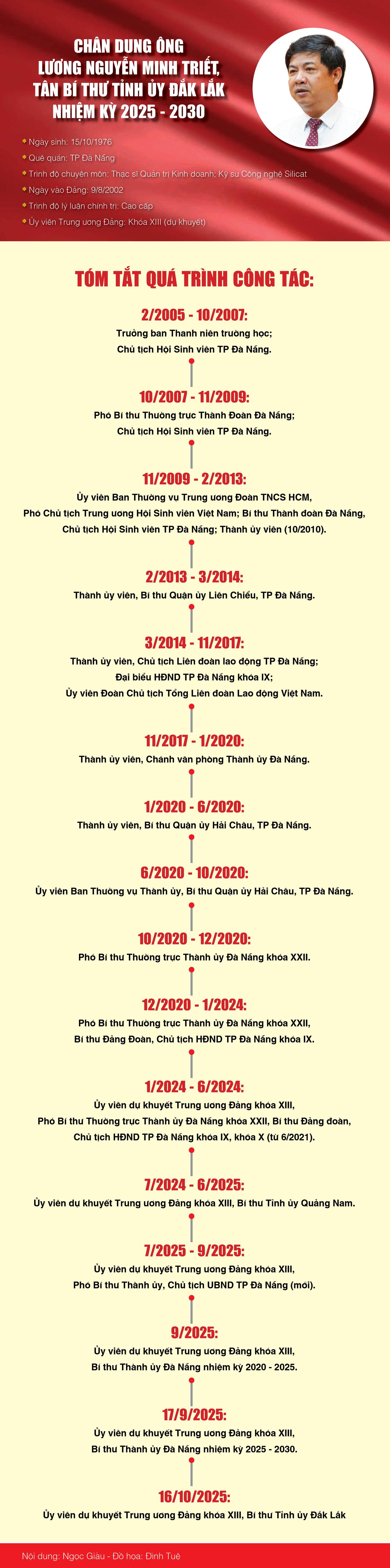 Đồng chí Lương Nguyễn Minh Triết - Ủy viên dự khuyết Trung ương Đảng, Bí thư Thành ủy Đà Nẵng đã được Bộ Chính trị điều động, chỉ định tham gia Ban Chấp hành, Ban Thường vụ Tỉnh uỷ Đắk Lắk, nhậm chức Bí thư Tỉnh uỷ nhiệm kỳ 2025-2030.
