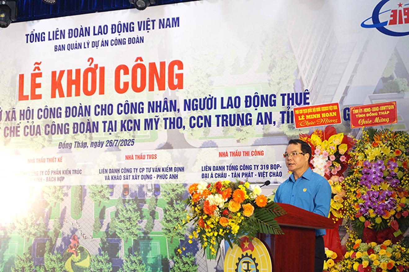 Đồng Tháp thực hiện nhiều chính sách ưu đãi cho nhà ở xã hội. Trong ảnh là buổi lễ khởi công nhà ở xã hội của Tổng Liên đoàn Lao động Việt Nam trên địa bàn Đồng Tháp tháng 7/2025 (Ảnh: Cổng thông tin điện tử Đồng Tháp)