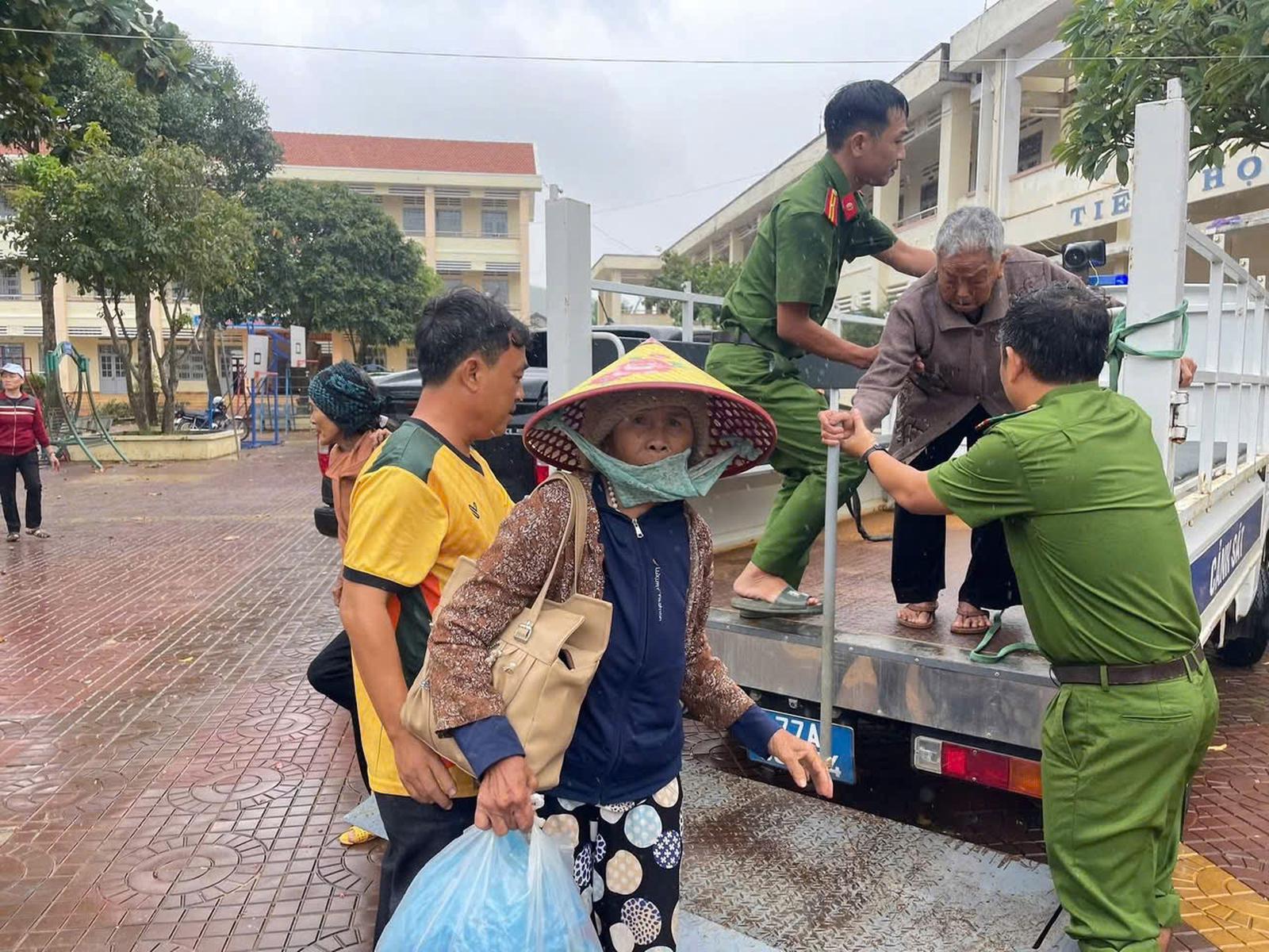 Lực lượng Công an, dân quân, đoàn thể đang khẩn trương hỗ trợ người dân di dời đến nơi an toàn. Ảnh: Hoài Nhơn Đông