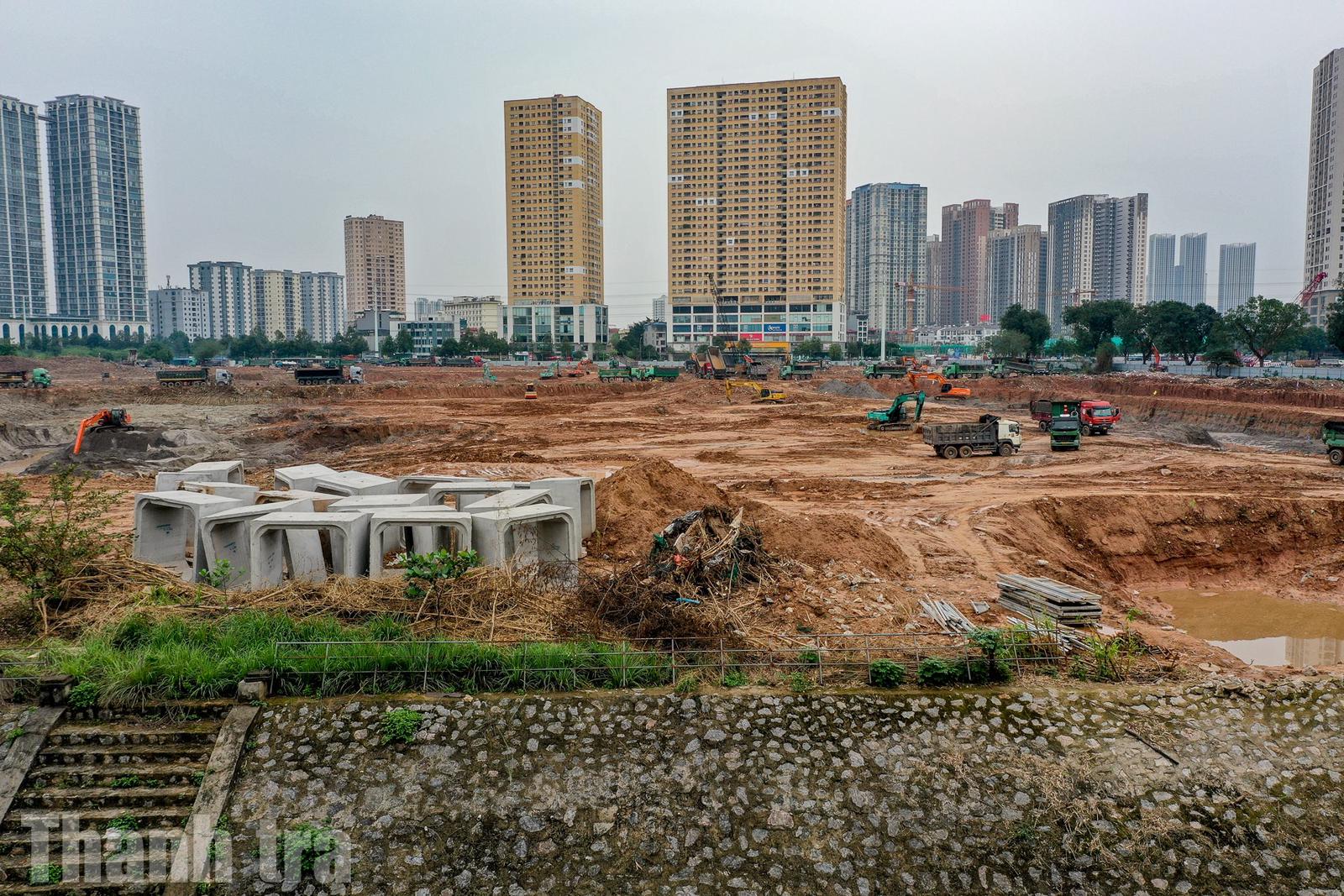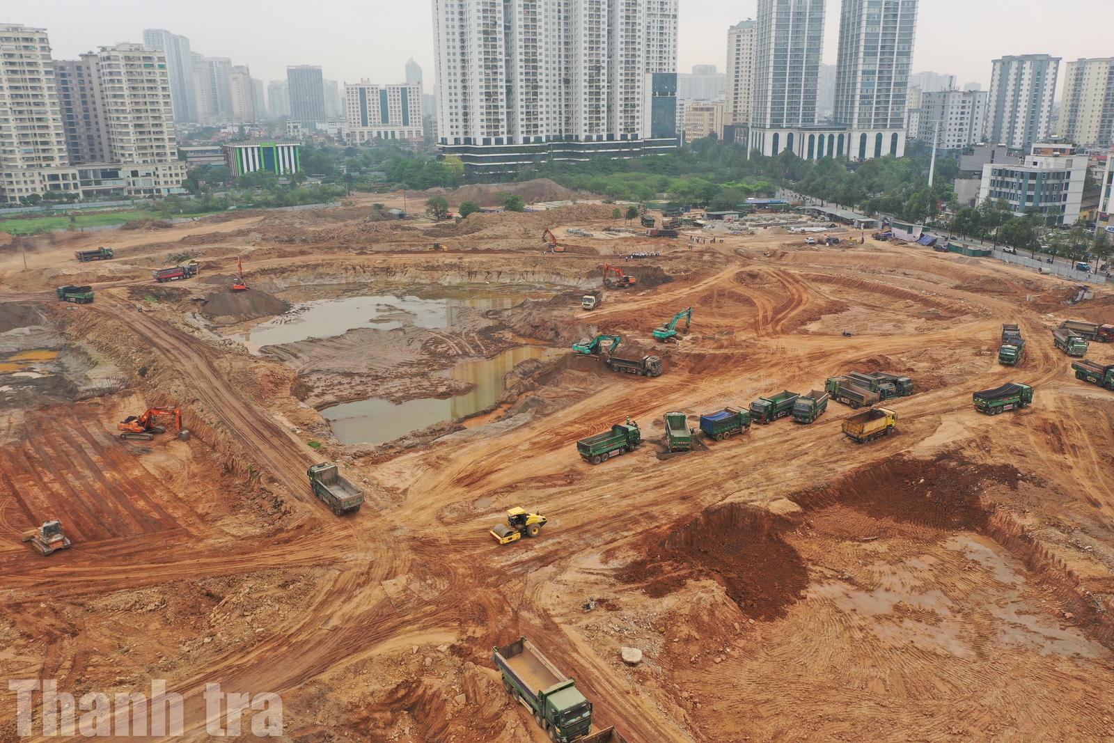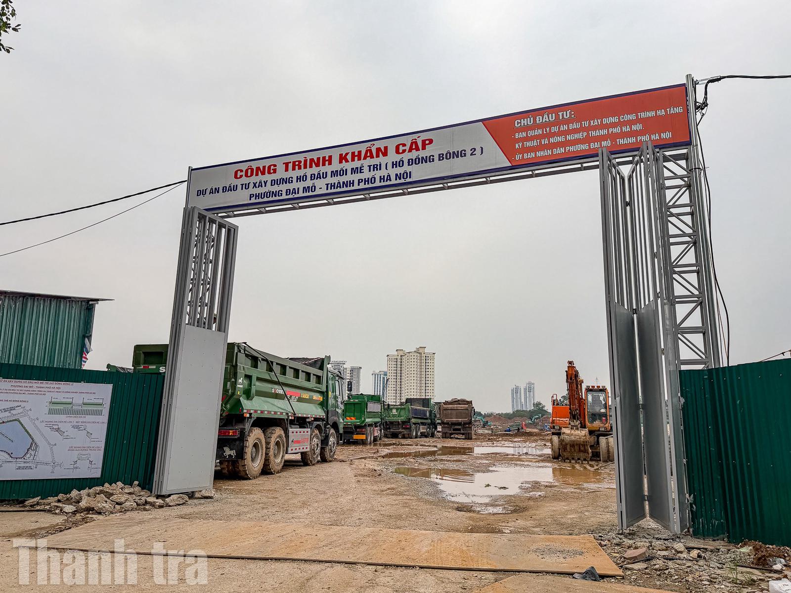 Những ngày đầu tháng 4/2026, tại công trường thuộc Dự án xây dựng hồ điều hòa Mễ Trì (còn gọi là hồ Đồng Bông 2), tại phường Đại Mỗ, TP Hà Nội đang hoạt động nhộn nhịp với nhiều máy móc, phương tiện làm việc liên tục.