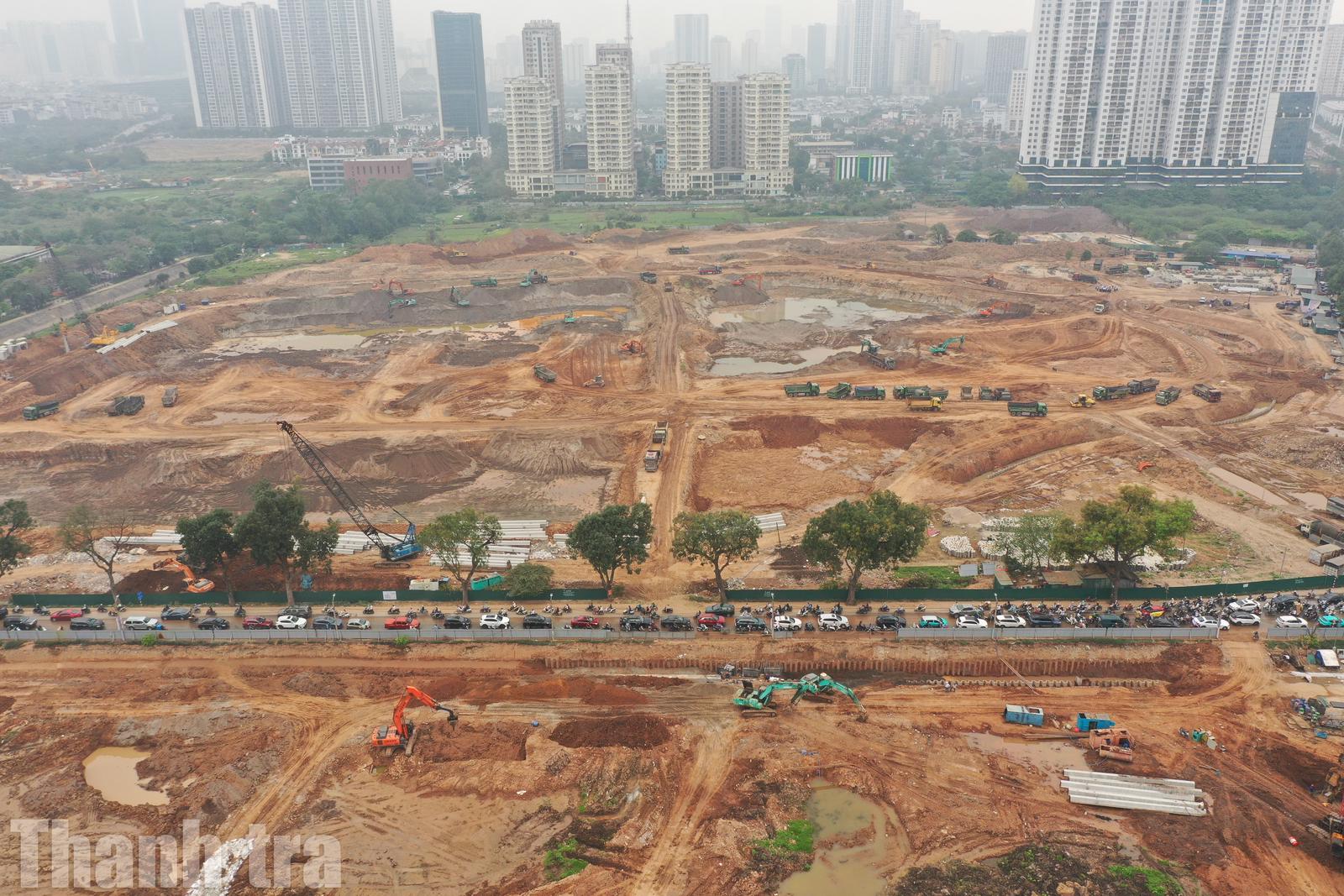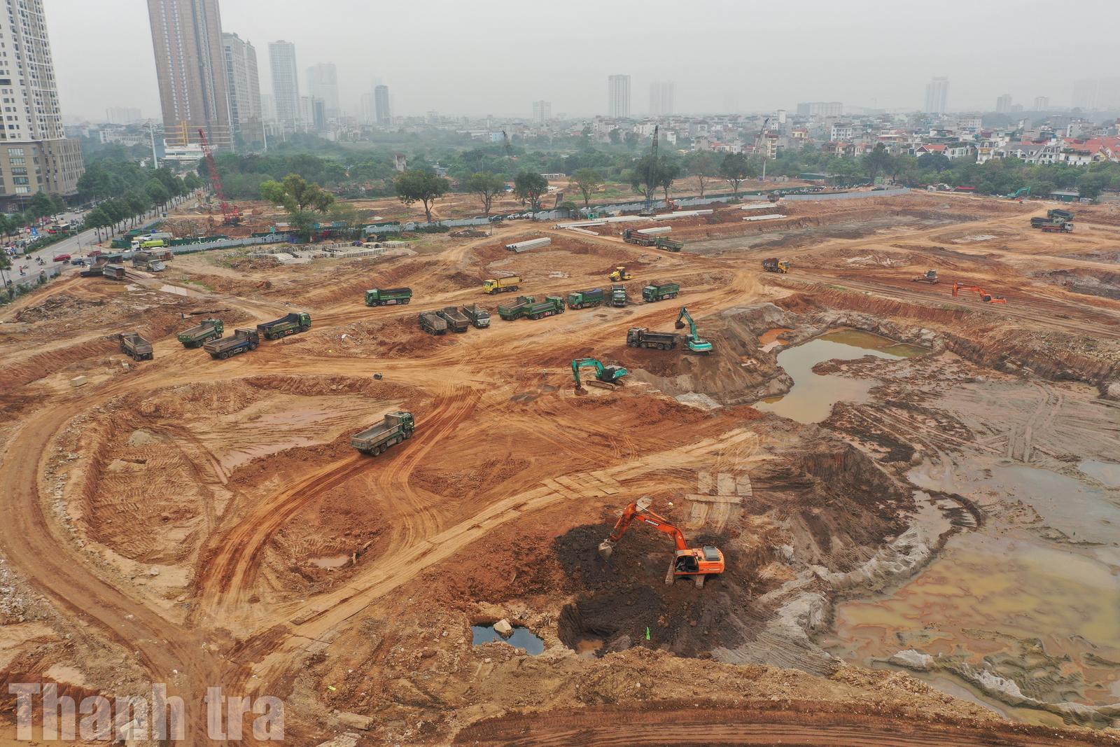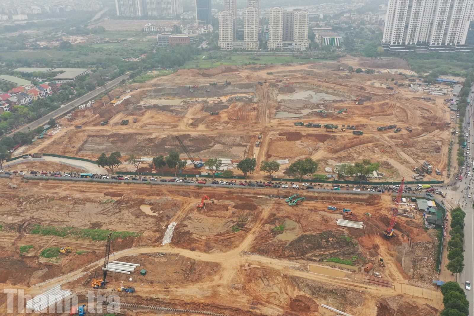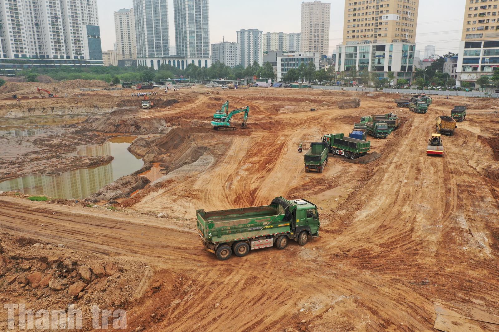 Những ngày đầu tháng 4/2026, tại công trường thuộc Dự án xây dựng hồ điều hòa Mễ Trì (còn gọi là hồ Đồng Bông 2), tại phường Đại Mỗ, TP Hà Nội đang hoạt động nhộn nhịp với nhiều máy móc, phương tiện làm việc liên tục.