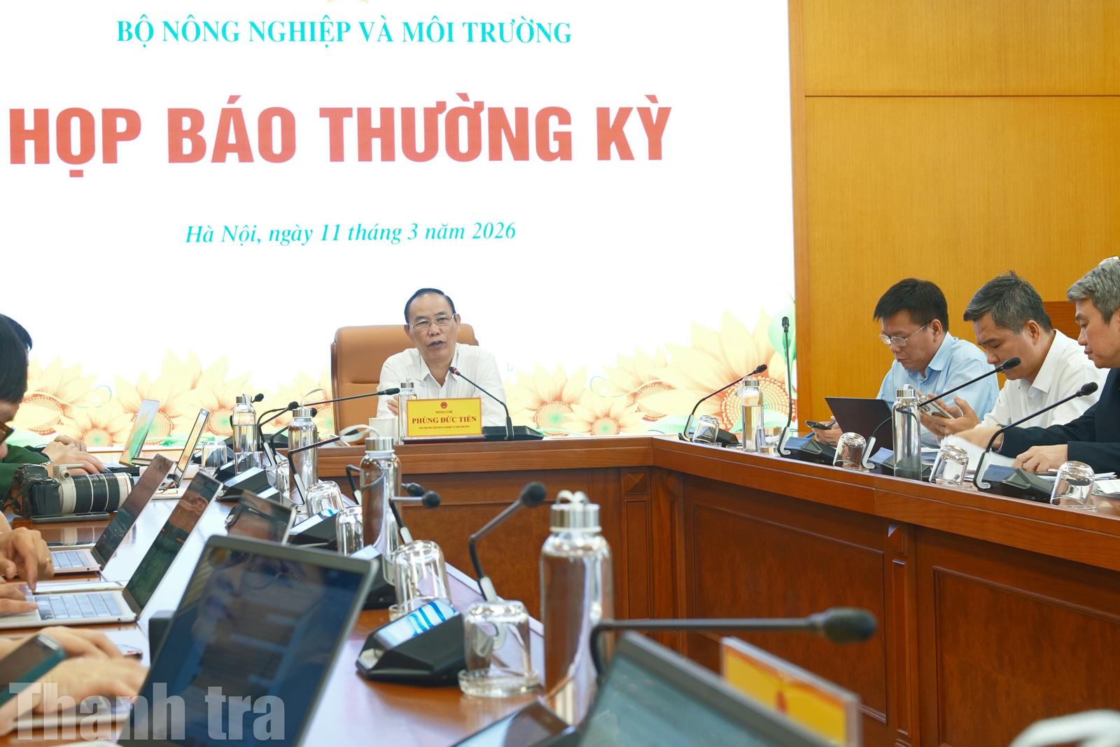 Thứ trưởng Bộ Nông nghiệp và Môi trường Phùng Đức Tiến chủ trì họp báo. Ảnh: TM