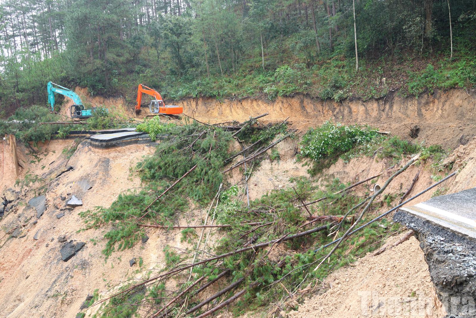 Toàn bộ mặt đường bị đứt gãy hoàn toàn, chiều rộng khoảng 50m, sâu khoảng 30m, chiều dài vệt trượt lên tới 100m, chia cắt tuyến giao thông. oàn bộ kết cấu mặt đường đã bị phá hủy hoàn toàn, tạo thành một hố sâu khổng lồ. Khối lượng lớn đất đá cùng nhiều cây thông bị bật gốc đổ ập xuống phía taluy âm, vùi lấp một phần diện tích đất sản xuất nông nghiệp của người dân.Ảnh: Vũ Linh