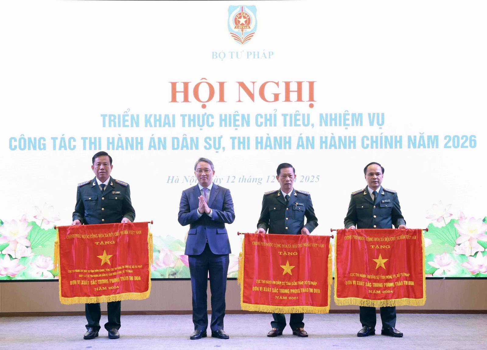 Thừa ủy quyền của Thủ tướng Chính phủ, Bộ trưởng Bộ Tư pháp Nguyễn Hải Ninh trao Cờ Thi đua của Chính phủ cho 3 tập thể, gồm: Cục THADS tỉnh Nghệ An (nay là THADS tỉnh Nghệ An), Cục THADS tỉnh Đồng Tháp (nay là THADS tỉnh Đồng Tháp), Cục THADS tỉnh Kiên Giang (nay là THADS tỉnh Kiên Giang). Ảnh: T.Oanh