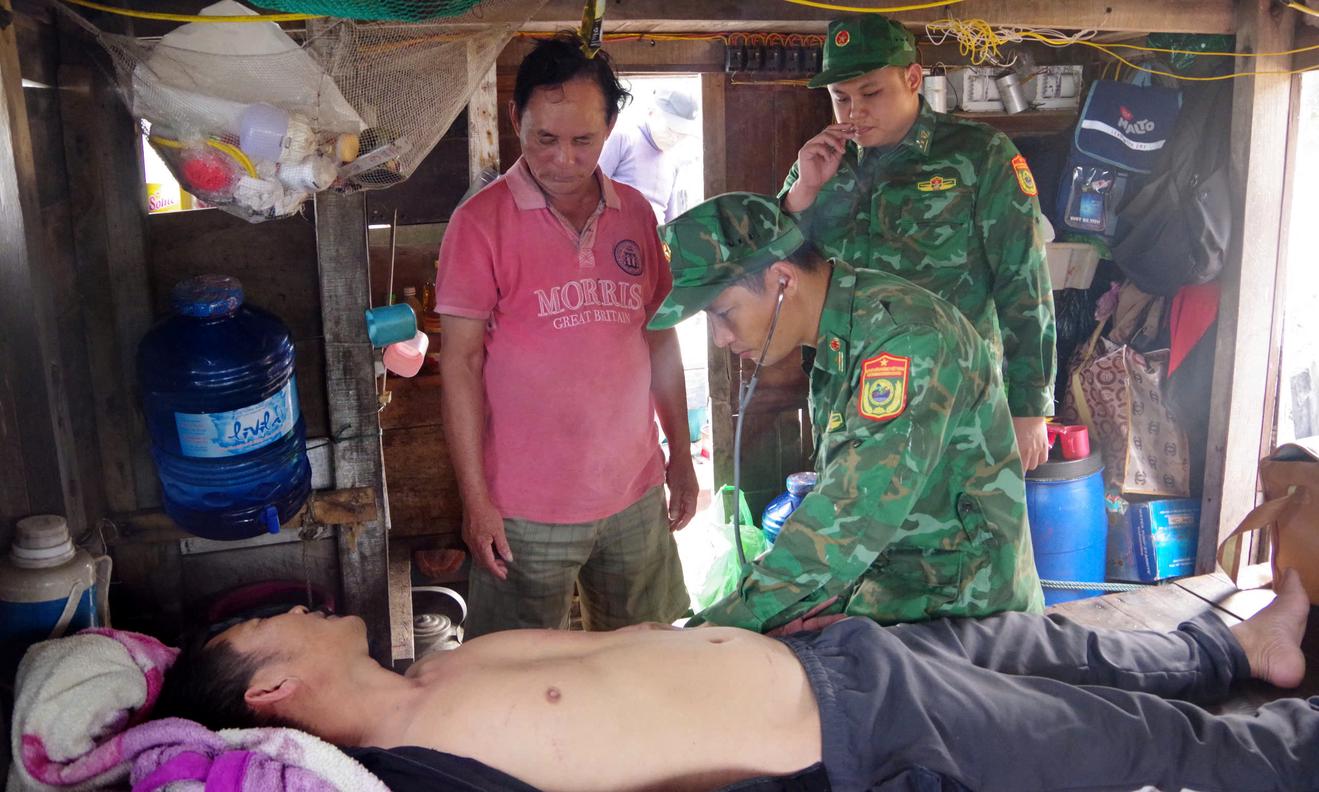 1) Quân y BĐBP Quảng Trị thăm khám, điều trị, cấp thuốc cho ngư dân gặp nạn. Ảnh: Minh Tân