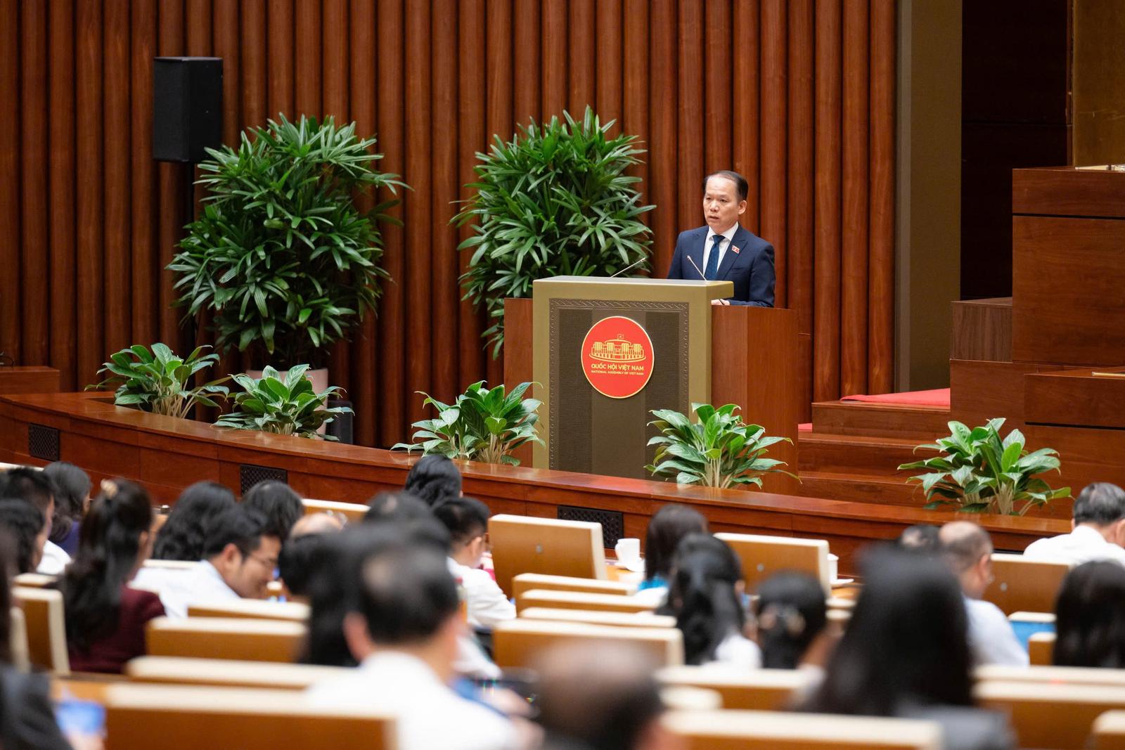 Bộ trưởng Bộ Tư pháp Hoàng Thanh Tùng trình bày báo cáo tiếp thu, giải trình, chỉnh lý dự án luật trước khi các đại biểu Quốc hội bấm nút. Ảnh: P.Thắng