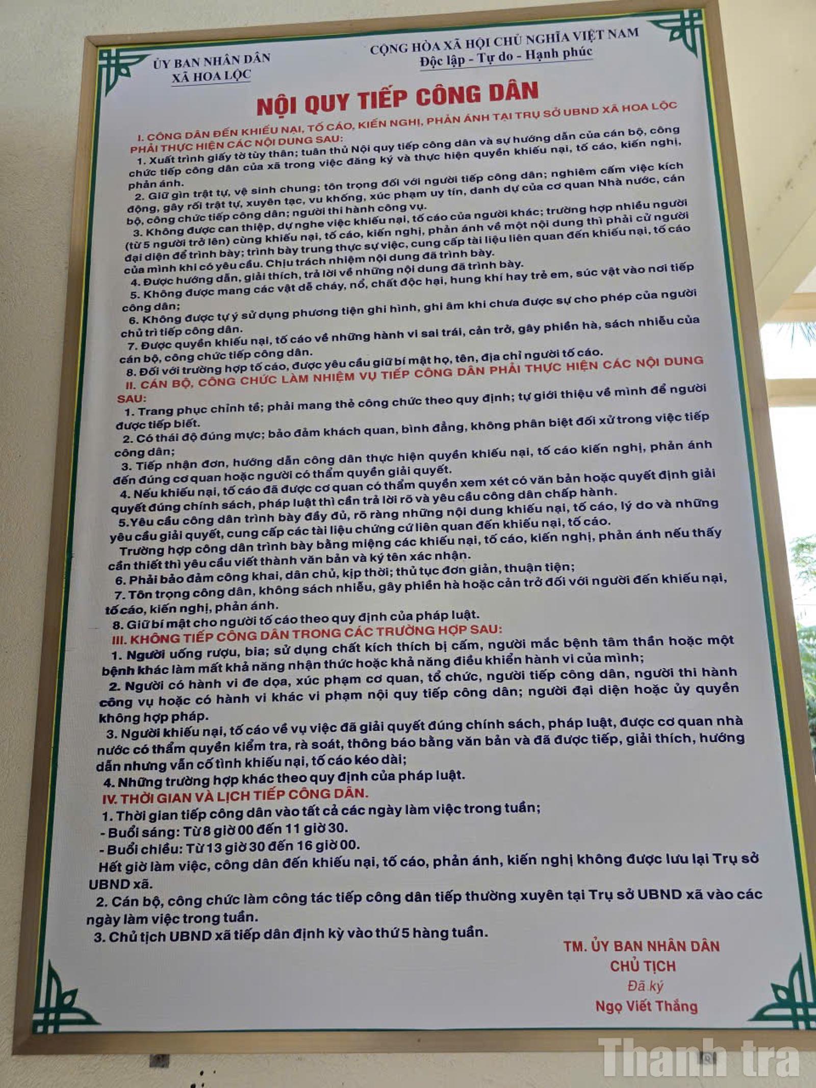 Ông Thắng cũng cho biết thêm, xã Hoa Lộc đã ban hành nội quy tiếp công dân và Lịch tiếp dân định kỳ của Chủ tịch UBND xã, đồng thời phân công cán bộ chuyên trách tiếp công dân thường xuyên. “Tất cả đều nhằm đảm bảo việc tiếp nhận, giải quyết phản ánh, kiến nghị của Nhân dân được thực hiện minh bạch, đúng quy trình, đúng pháp luật,” ông Thắng nhấn mạnh.