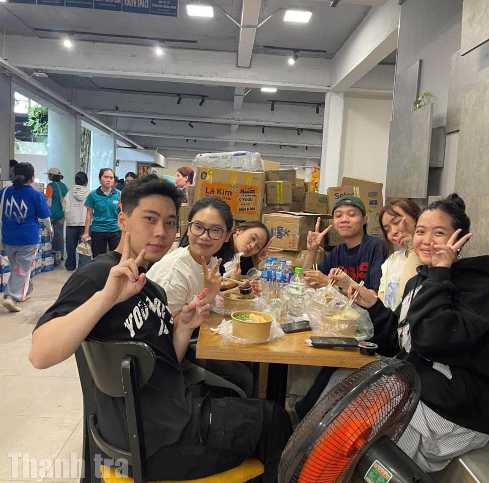 Sau những giờ khuân vác mệt phờ, vẫn không quên tặng miền Trung chữ V chiến thắng... Ảnh: TH