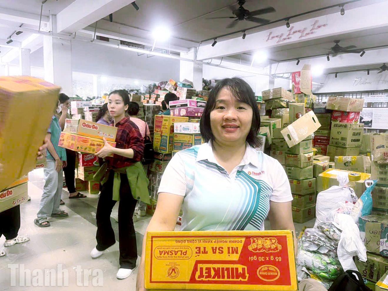 Chị Trần Thu Huyền, phóng viên Báo Thanh tra tham gia tích cực để gửi hàng hỗ trợ bà con vùng lũ. Ảnh: TH