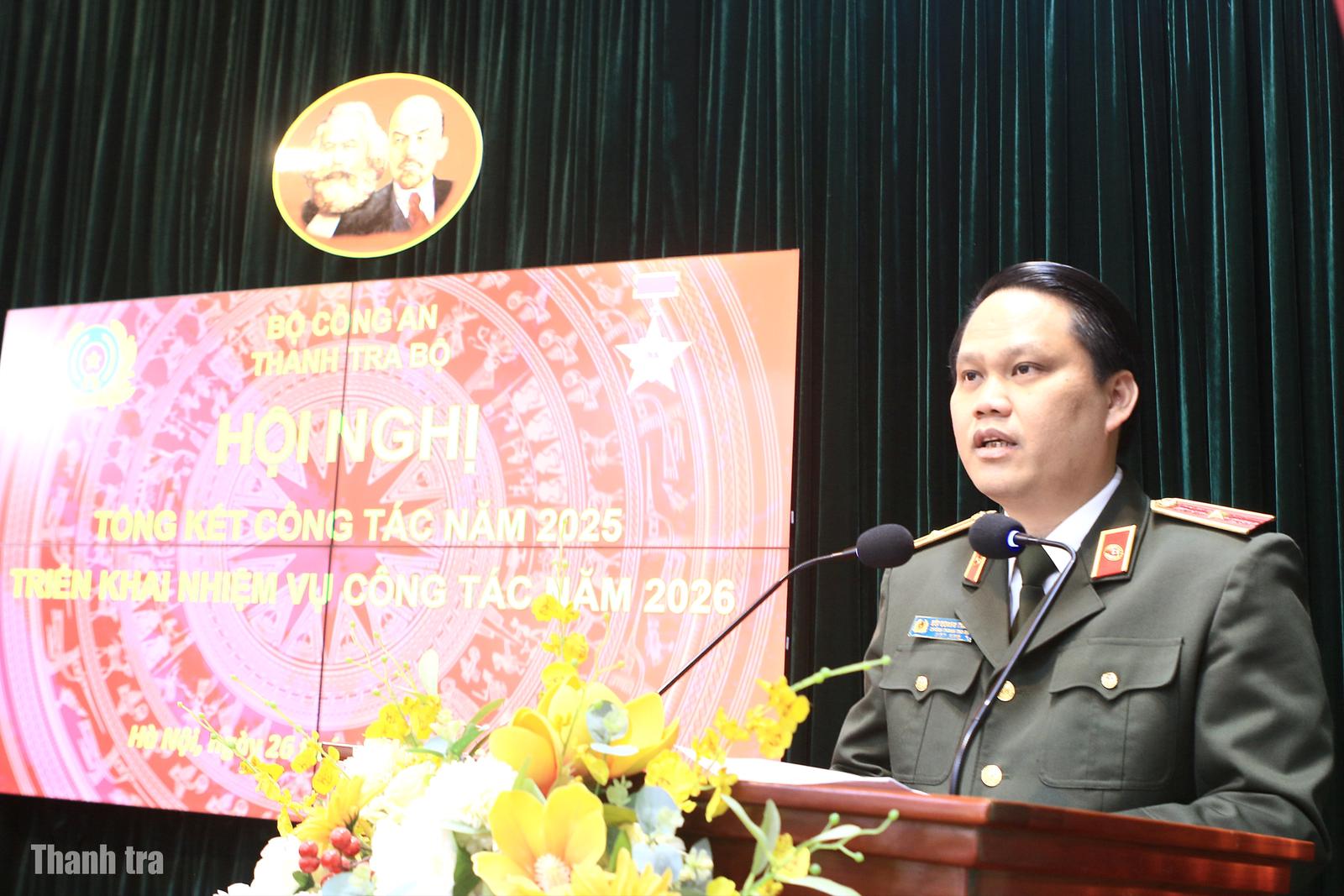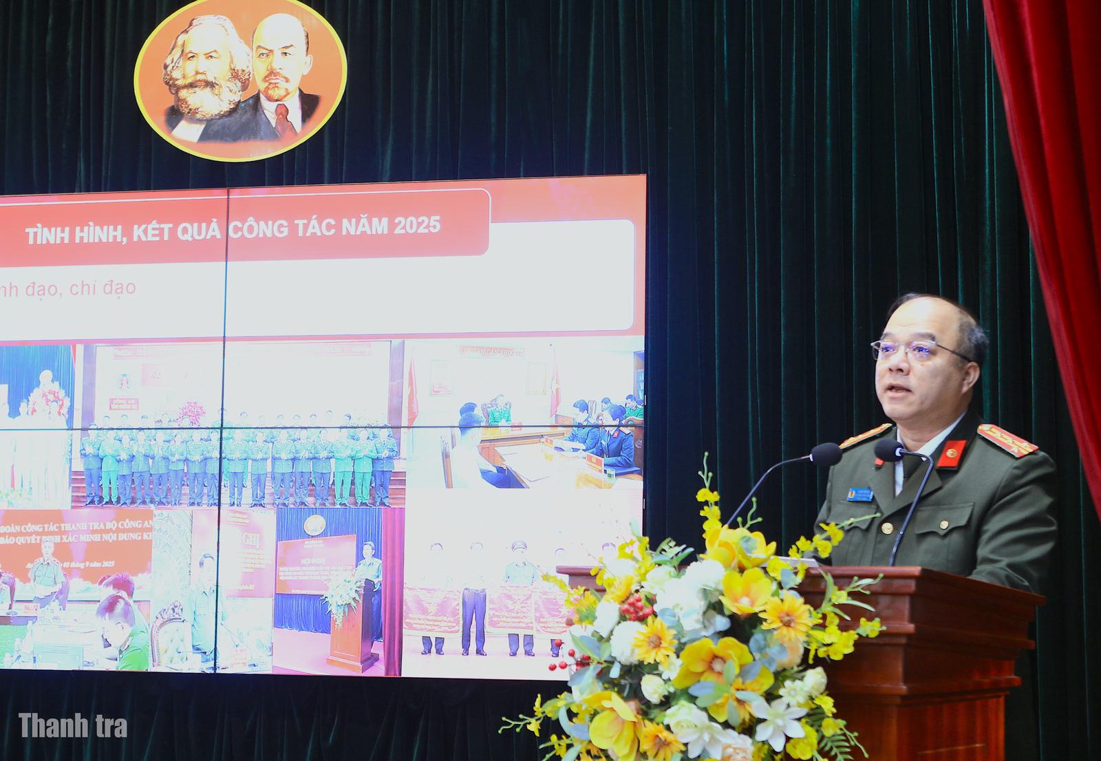 Trình bày báo cáo tổng kết công tác năm 2025 và phương hướng nhiệm vụ năm 2026, Đại tá Trần Văn Thư, Phó Chánh Thanh tra Bộ Công an cho biết, được sự quan tâm, chỉ đạo trực tiếp, toàn diện của Đảng ủy Công an Trung ương (CATW), lãnh đạo Bộ Công an; sự phối hợp, giúp đỡ hiệu quả của các đơn vị, tổ chức, cá nhân về thực hiện nhiệm vụ công tác thanh tra năm 2025, Thanh tra Bộ đã đạt được các kết quả nổi bật.