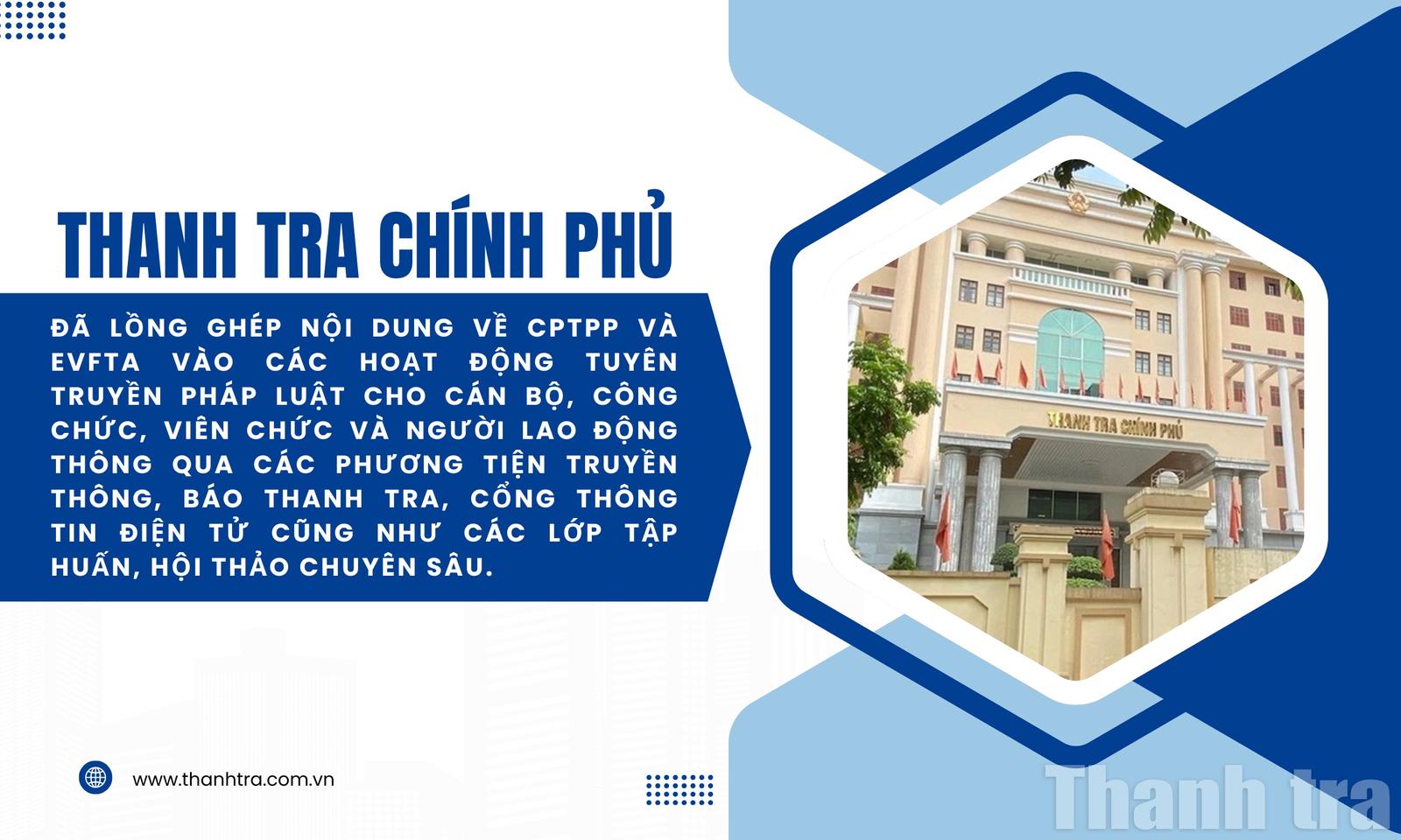 Công tác tuyên truyền, phổ biến nội dung các hiệp định được Thanh tra Chính phủ triển khai một cách bài bản và có trọng tâm. Căn cứ vào các Kế hoạch số 662/KH-TTCP về việc thực hiện Hiệp định CPTPPKế hoạch số 1458/KH-TTCP về việc thực hiện Hiệp định EVFTA, Thanh tra Chính phủ đã lồng ghép nội dung về CPTPP và EVFTA vào các hoạt động tuyên truyền pháp luật cho cán bộ, công chức, viên chức và người lao động thông qua các phương tiện truyền thông, Báo Thanh tra, Cổng thông tin điện tử cũng như các lớp tập huấn, hội thảo chuyên sâu.