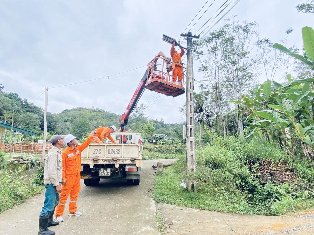 Công nhân Đội QLĐLKV Tuần Giáo triển khai lắp hệ thống chiếu sáng tại bản Huổi Hạ