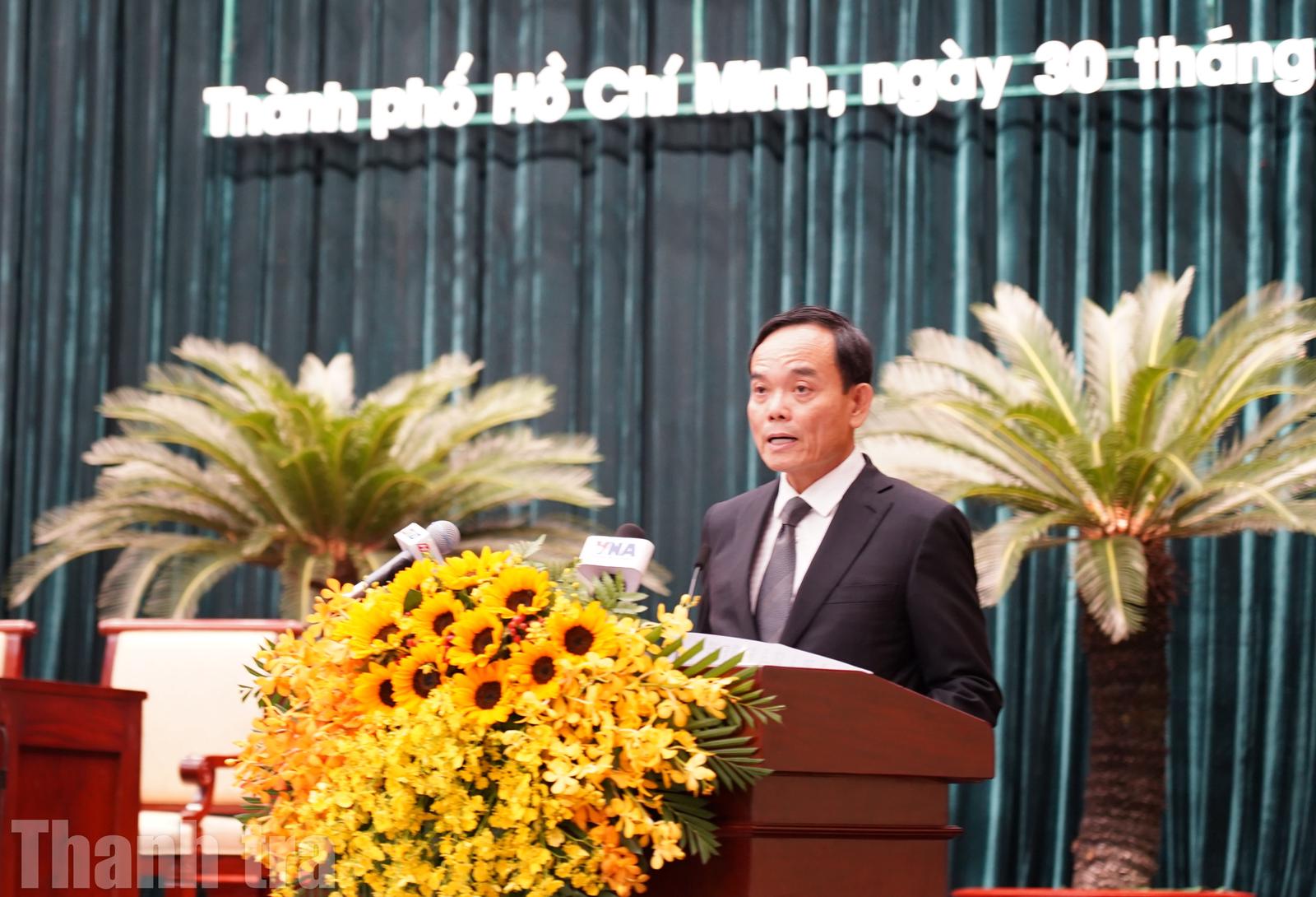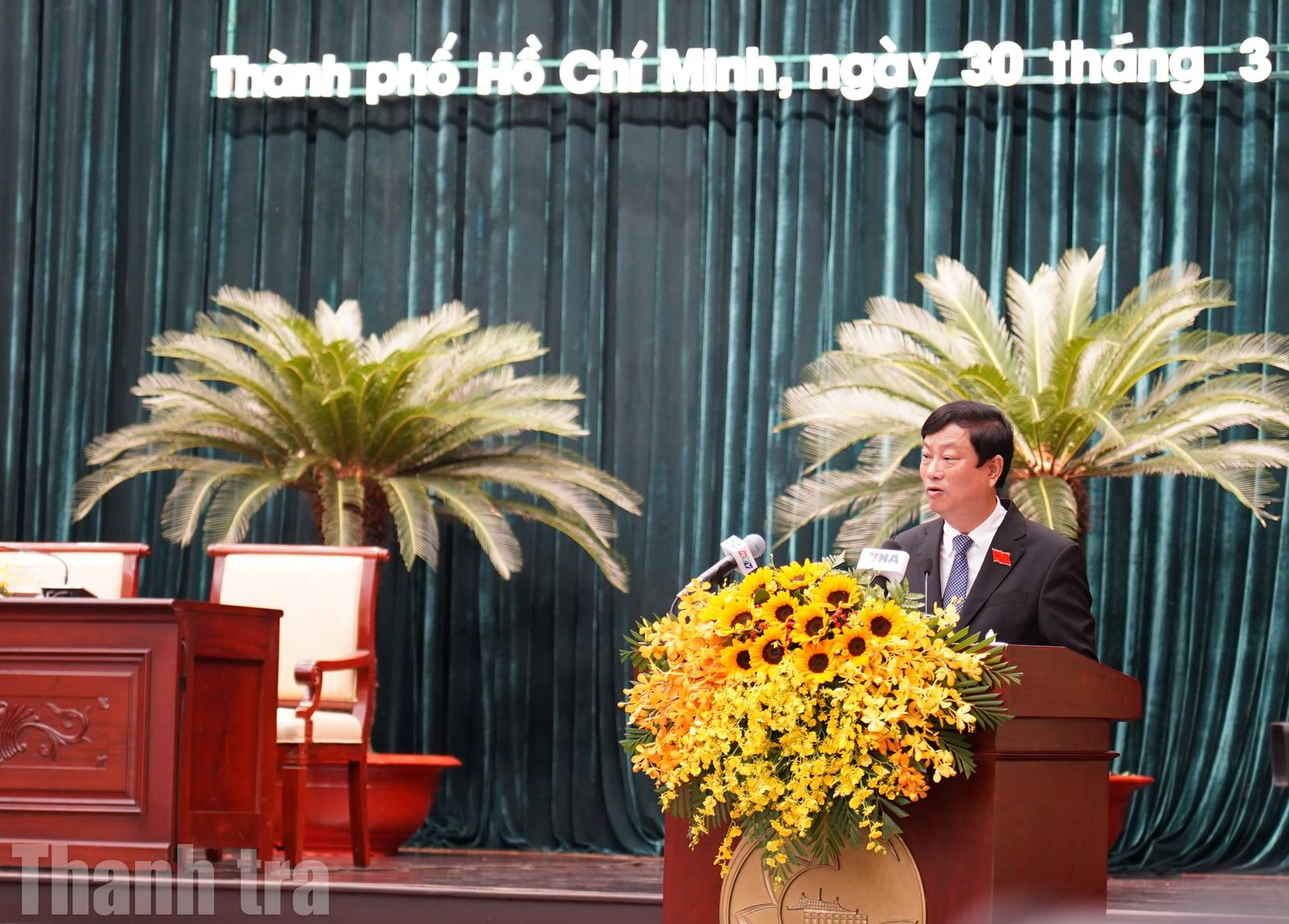 Ủy viên Bộ Chính trị, Bí thư Thành ủy TPHCM Trần Lưu Quang phát biểu tại kỳ họp. Ảnh: Chu Tuấn